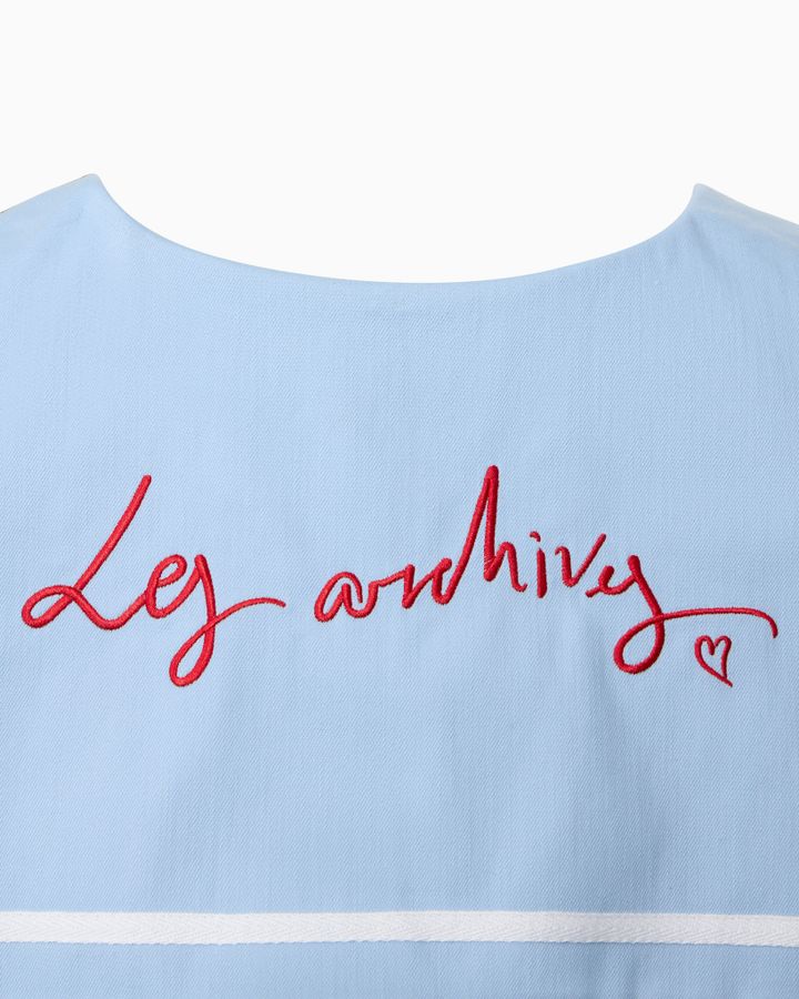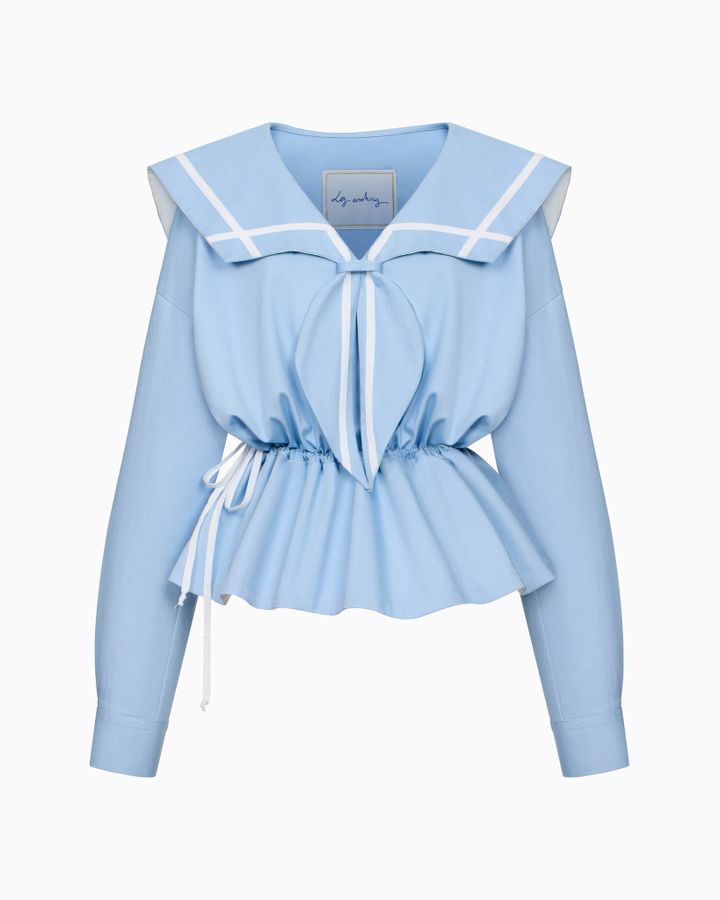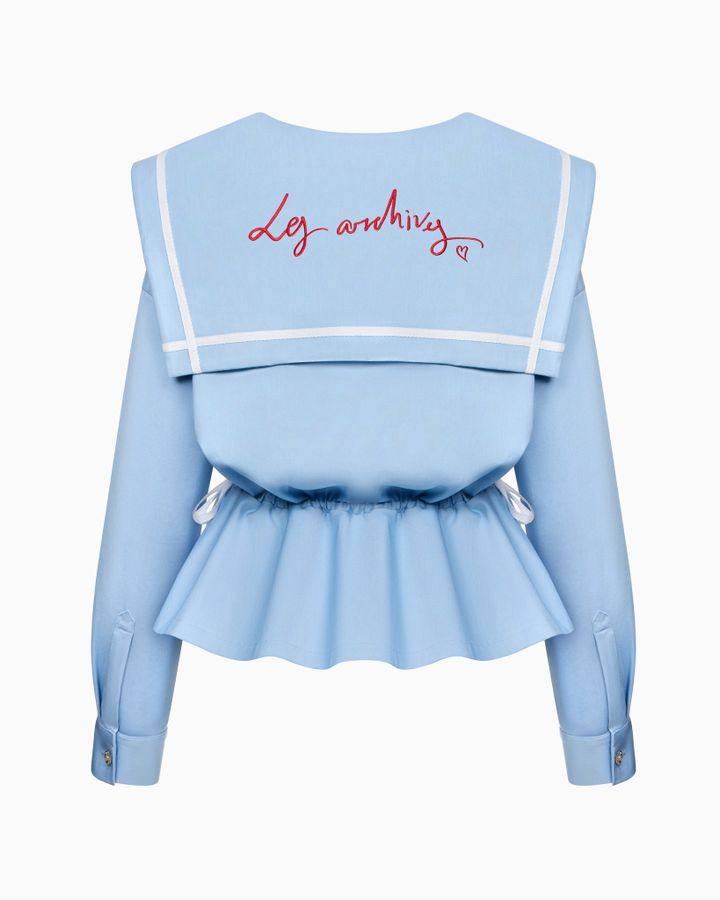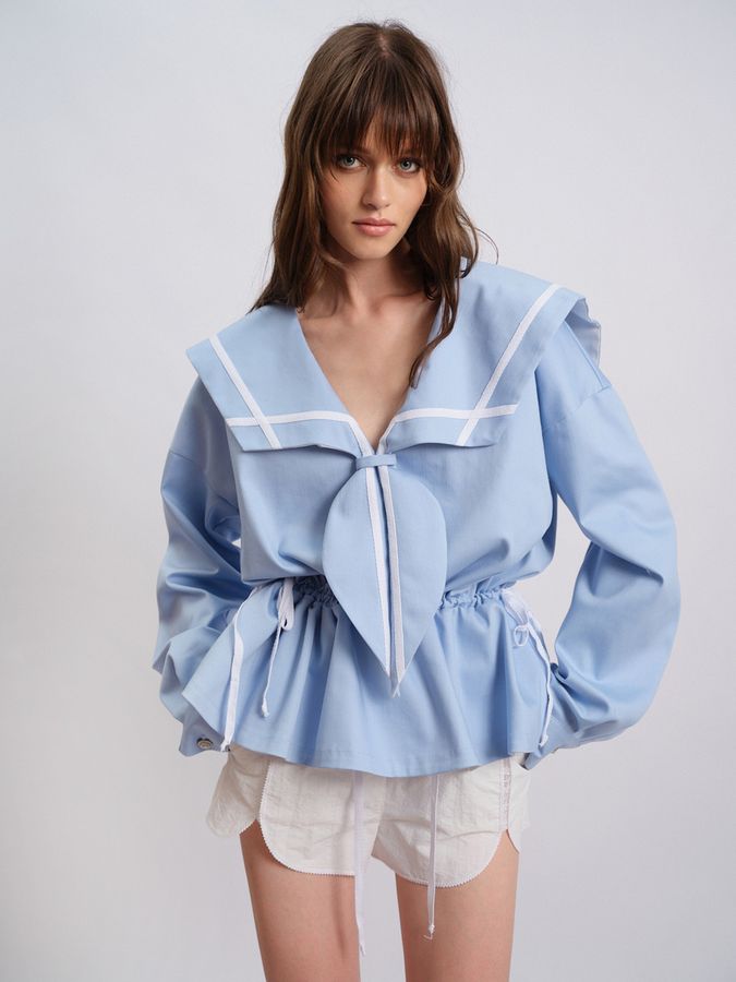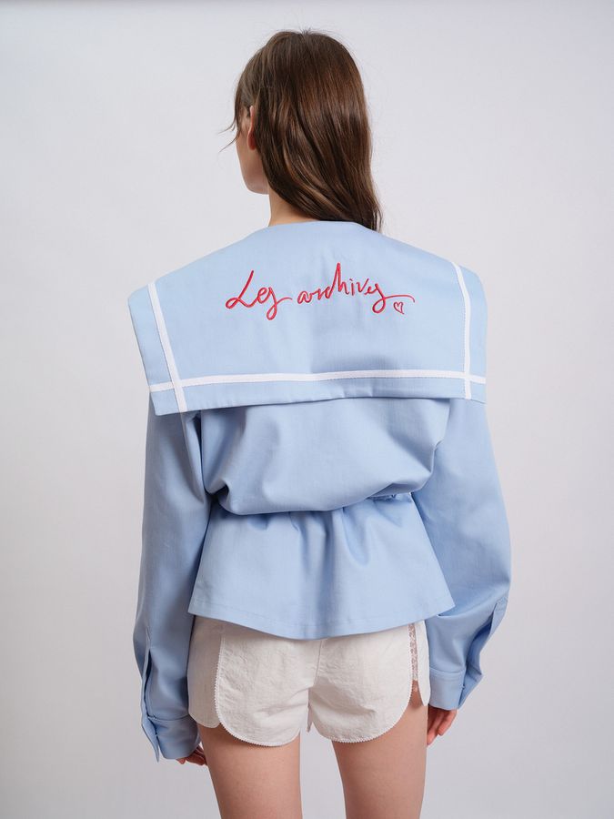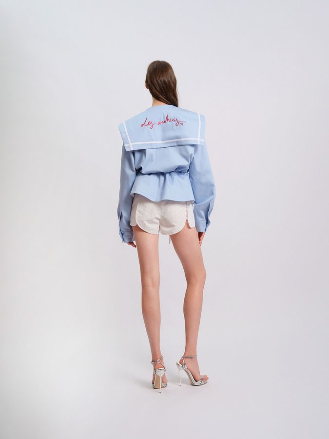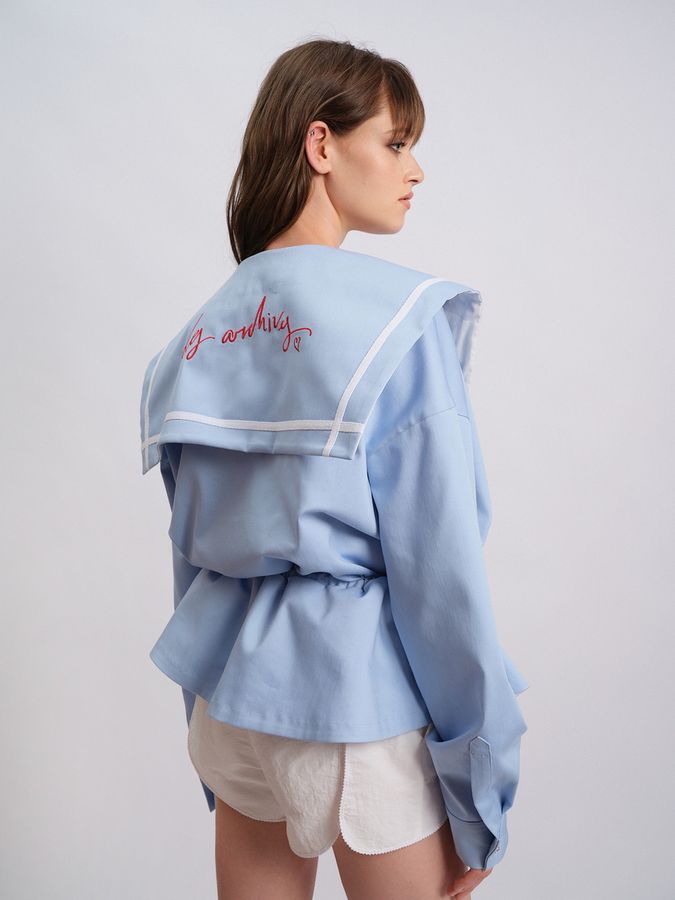 A sky-colored anorak with an accent collar and adjustable waist - designed with love to captivate you with bold detailing and thoughtful aesthetics. The perfect fit is achieved through the use of dense cotton. The voluminous collar trimmed with contrasting rep ribbon creates the effect of a shawl thrown over the shoulders. The contrasting red embroidery with the brand's logo on the back of the collar is eye-catching, while a drawstring at the waist allows you to adjust the volume and shape the desired silhouette. Loose cuffed sleeves bring a touch of relaxed style, balancing out the bold accents. Style with mini shorts from the collection for a fresh summer look.