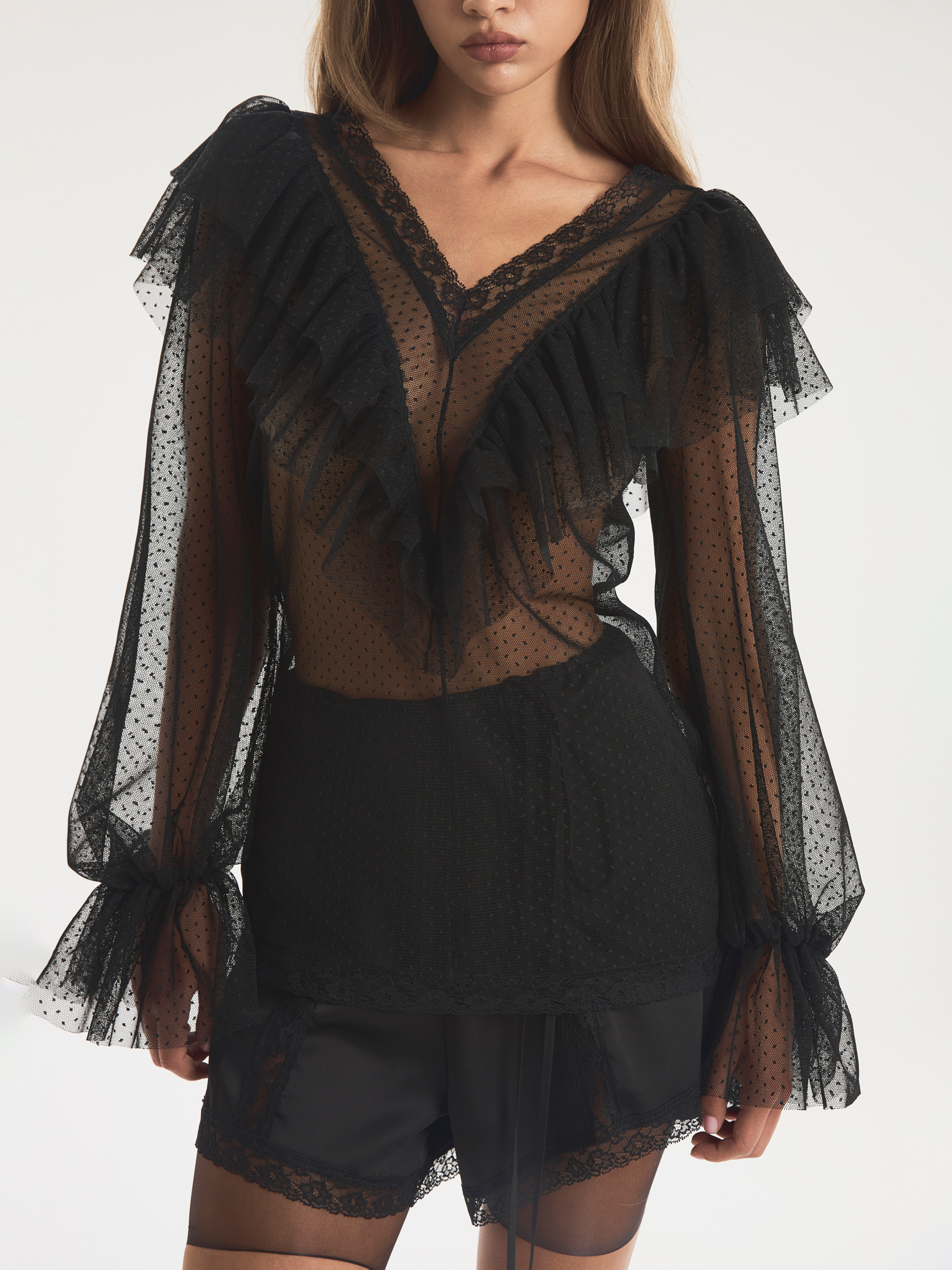 Нежная полупрозрачная блуза с рюшами на лифе. Вырез оформляет широкая полоска кружева. Лежащие на плечах двойные оборки повторяют форму V-образного выреза. Длинные рукава заканчиваются манжетами со сборкой, доходящими до косточек кисти. Узор polka dot рассыпан по тюлю мелкими точками, подчеркивающими прозрачность основы. Свободный крой позволяет материалу наслаиваться и собираться складками, создавая игру теней и света. Модель доступна в белом и черном вариантах.