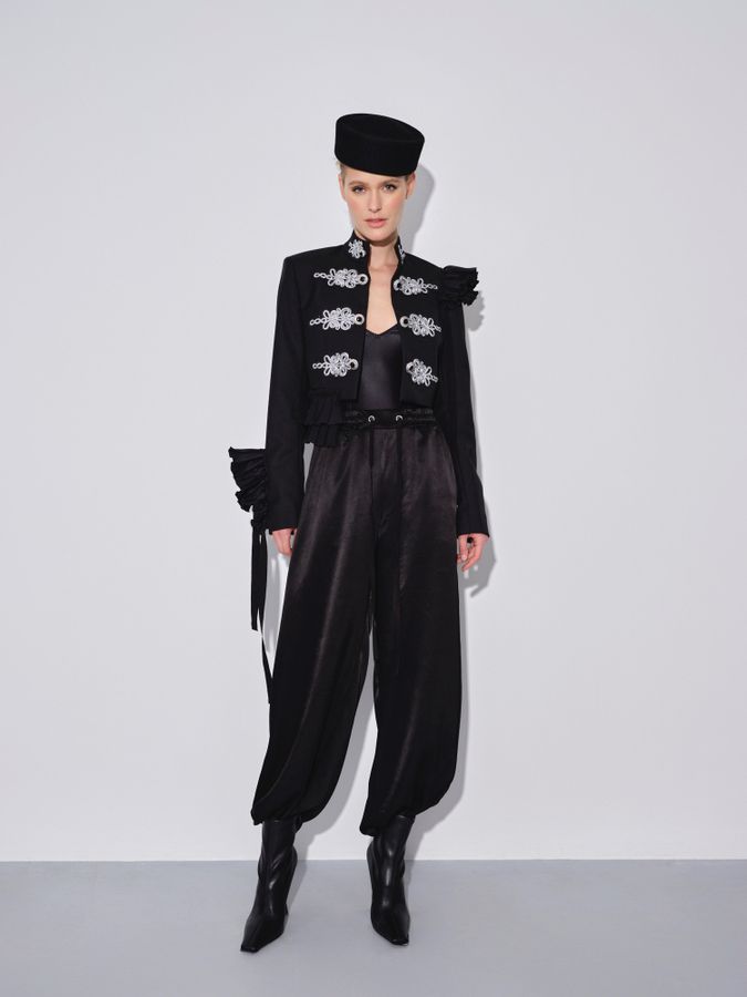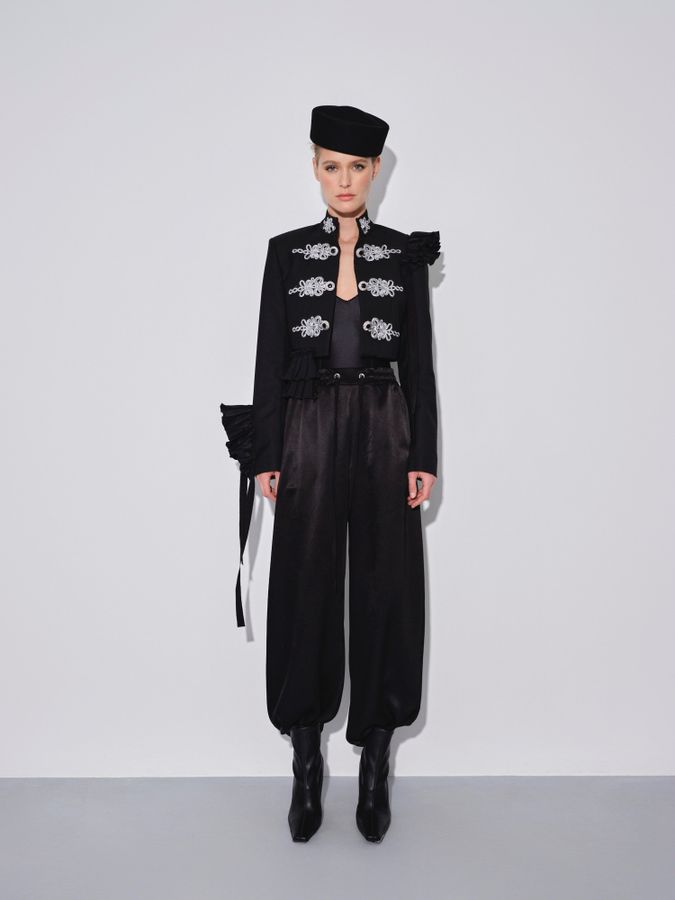 Брюки-карго из струящейся атласной ткани, как новое прочтение полюбившихся всем стритстайлерам мира брюк. В коллекции бренда дизайнеры представляют карго с ярким и женственным жакетом, что помогает по-новому взглянуть на привычные карго.