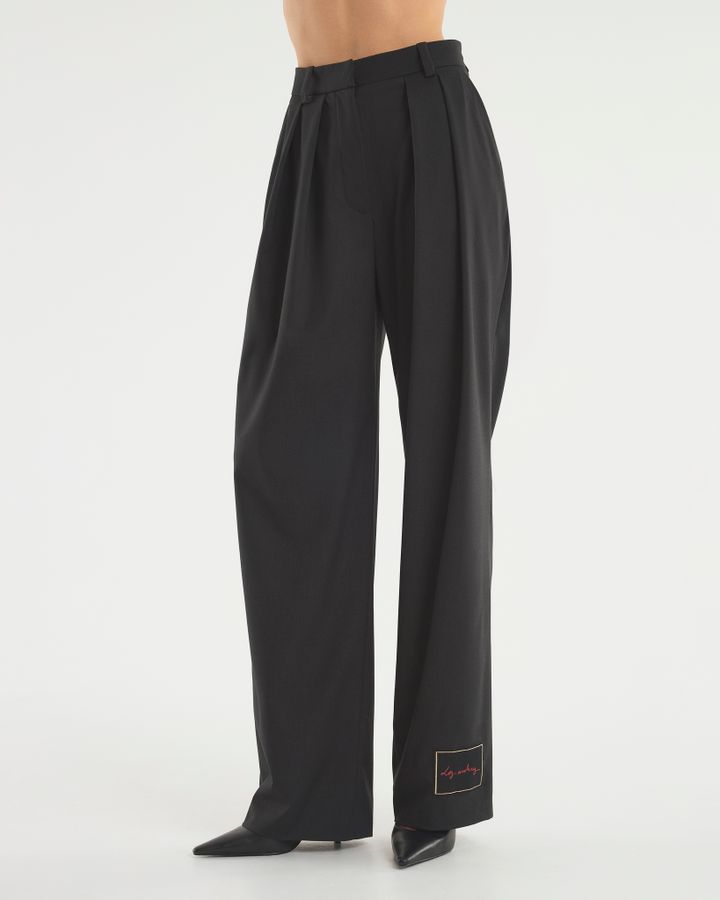 Классические серые брюки с мягкими складками на поясе создают красивый объем в районе бедер. Широкий пояс со шлевками можно акцентировать ремнем. Носите с облегающим боди или коротким джемпером, которые подчеркнут талию.