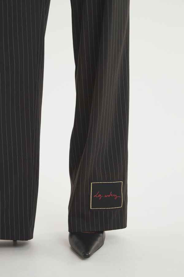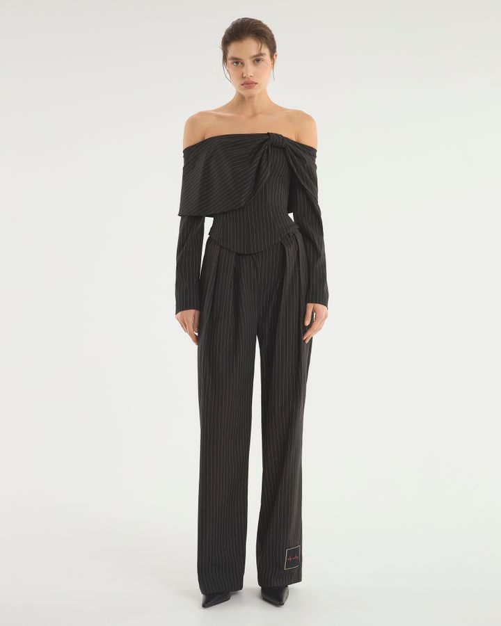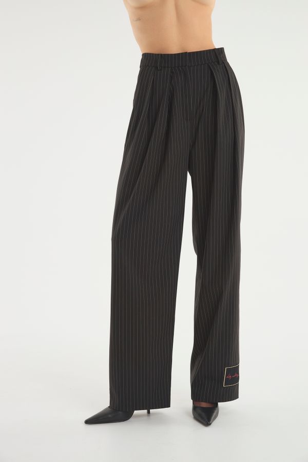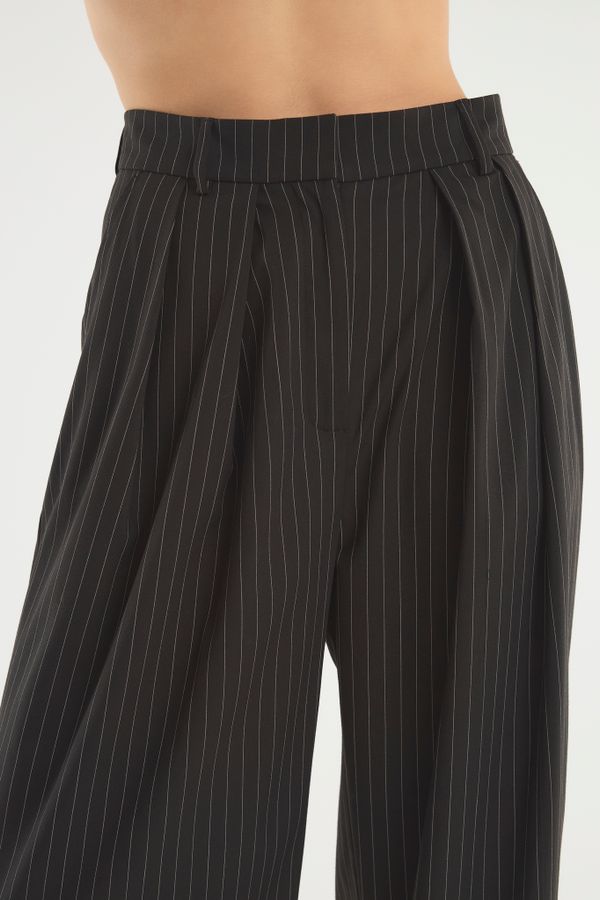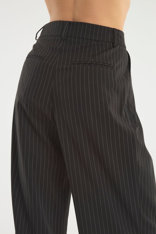 Классические черные брюки в тонкую полоску. Мягкие складки на поясе создают красивый объем в районе бедер. Широкий пояс со шлевками можно акцентировать ремнем. Носите с облегающим боди или коротким джемпером, которые подчеркнут талию.