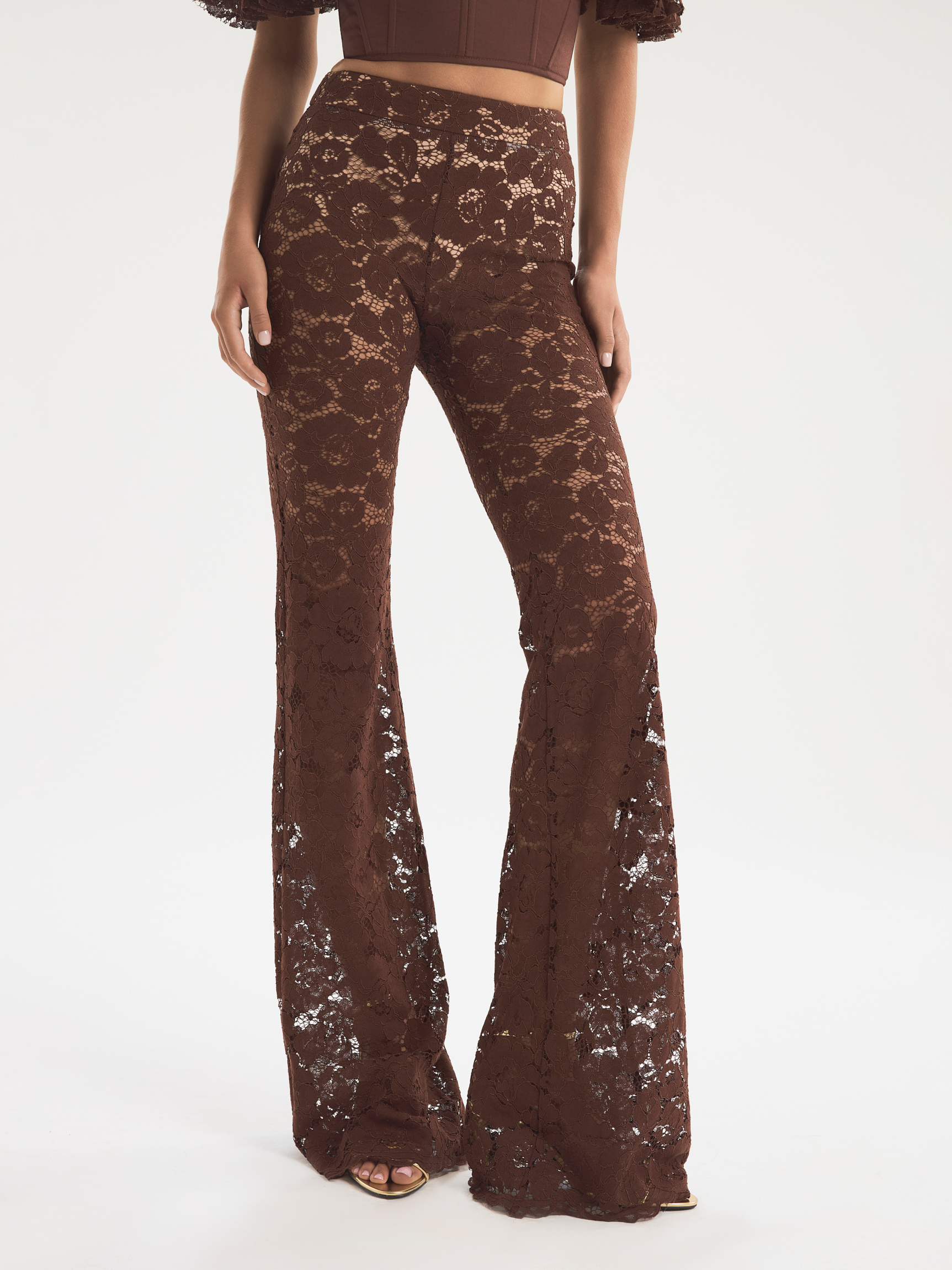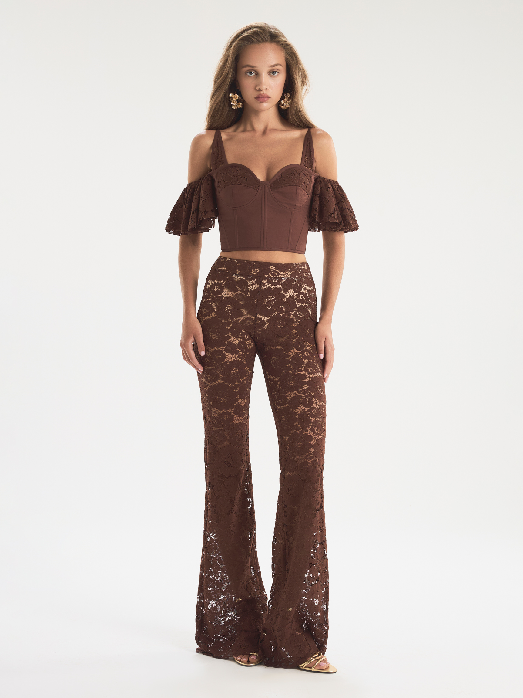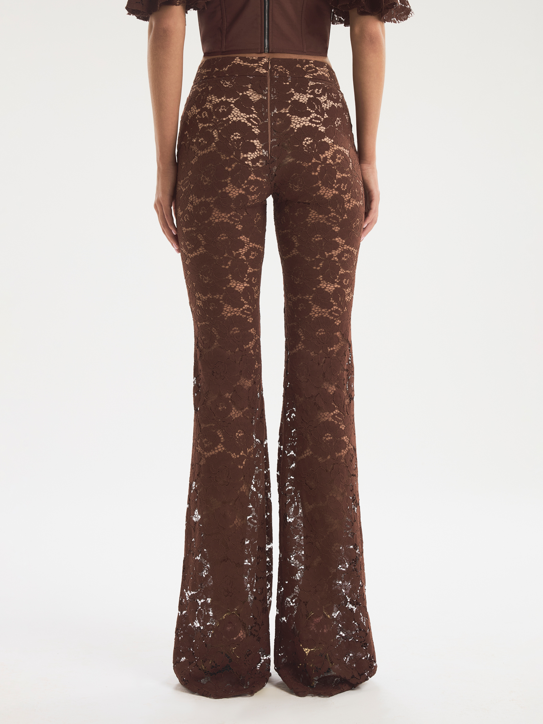 Брюки-клеш из ажурного гипюра с высокой талией и расклешенным силуэтом. Модель легкая и соблазнительная, создает впечатление обнаженности без излишней откровенности. Гипюр с романтичным цветочным узором выглядит необычно за счет теплого оттенка молочного шоколада. Брюки идеальны для вечерних выходов или особых случаев. Широкий пояс и облегание в районе бедер делают посадку безупречной.