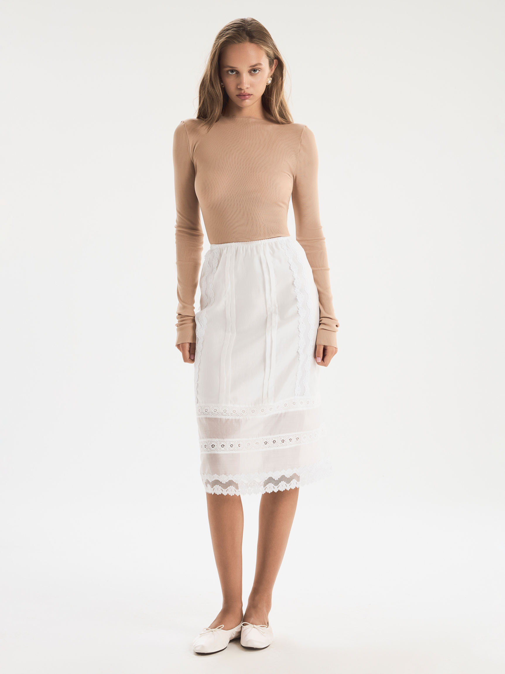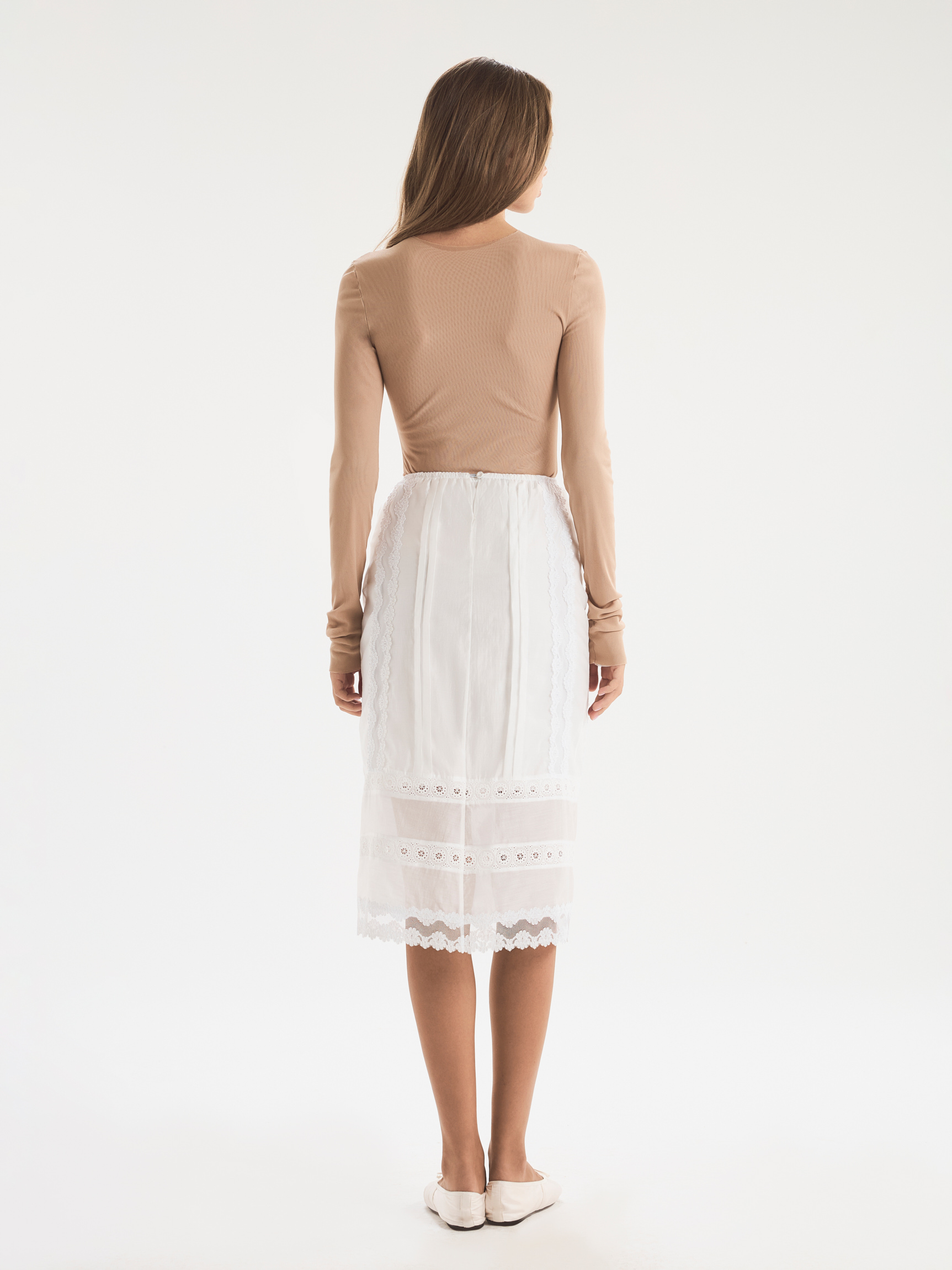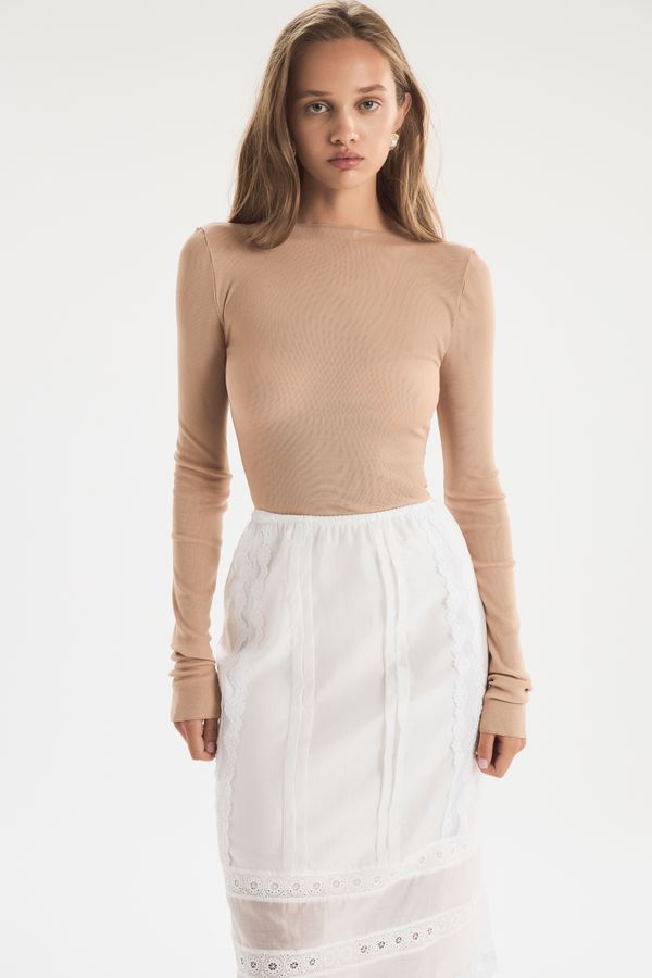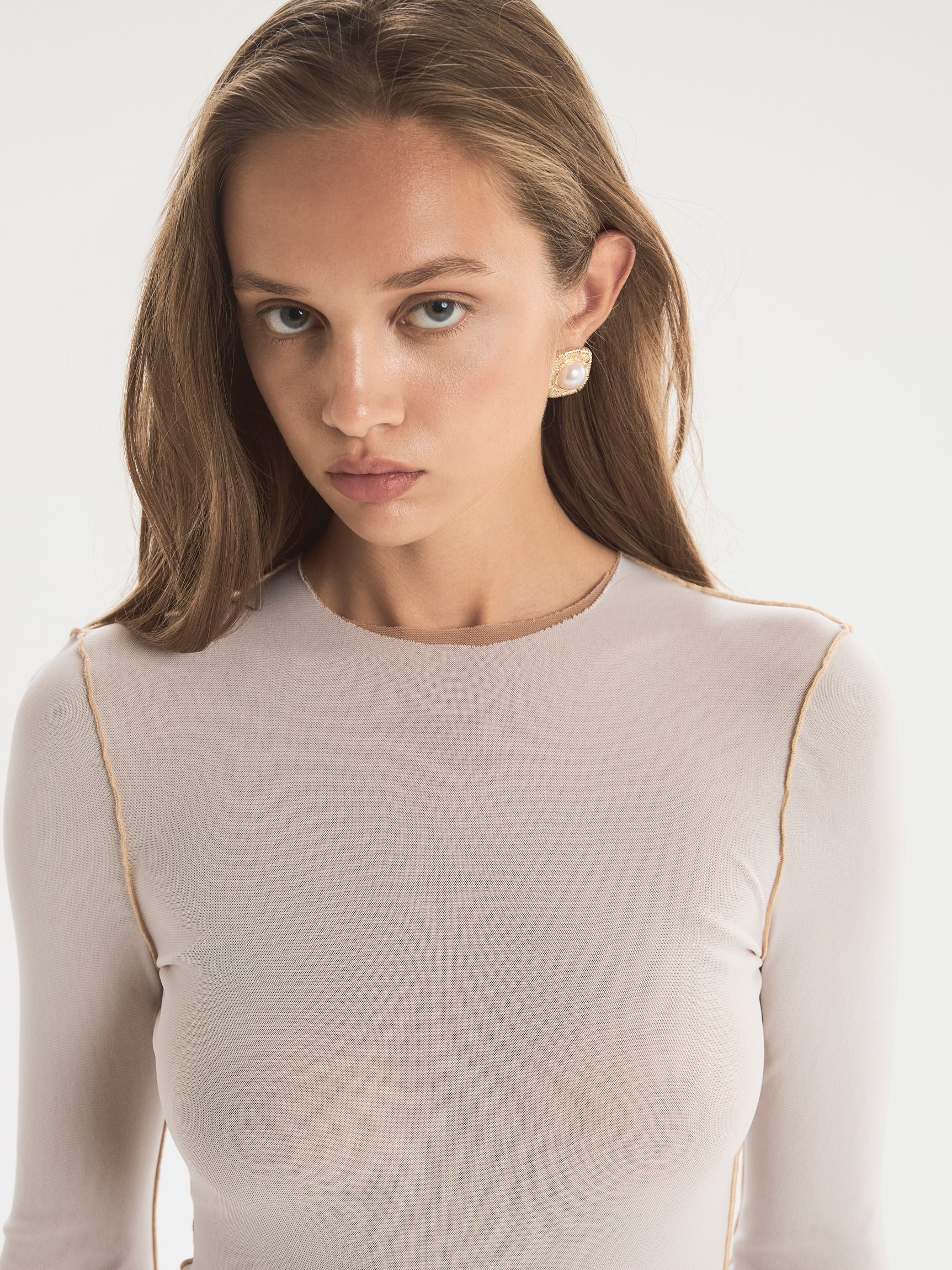 Двусторонний лонгслив из мягкой трикотажной сетки. Модель отличает округлый вырез под горло, длинные рукава и декоративные швы. Мягкое прилегание повторяет контуры тела. Ткань приятна, не сковывает движений. Лонгслив идеален в многослойных сочетаниях с жакетами, жилетами и комбинезонами. Бежевая сторона создает иллюзию обнаженного тела, а белая — впечатление прозрачности за счет нюдовой изнанки. Универсальная база для создания лаконичных и стильных образов.