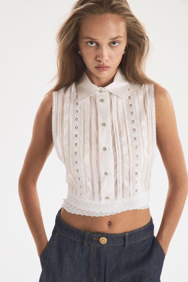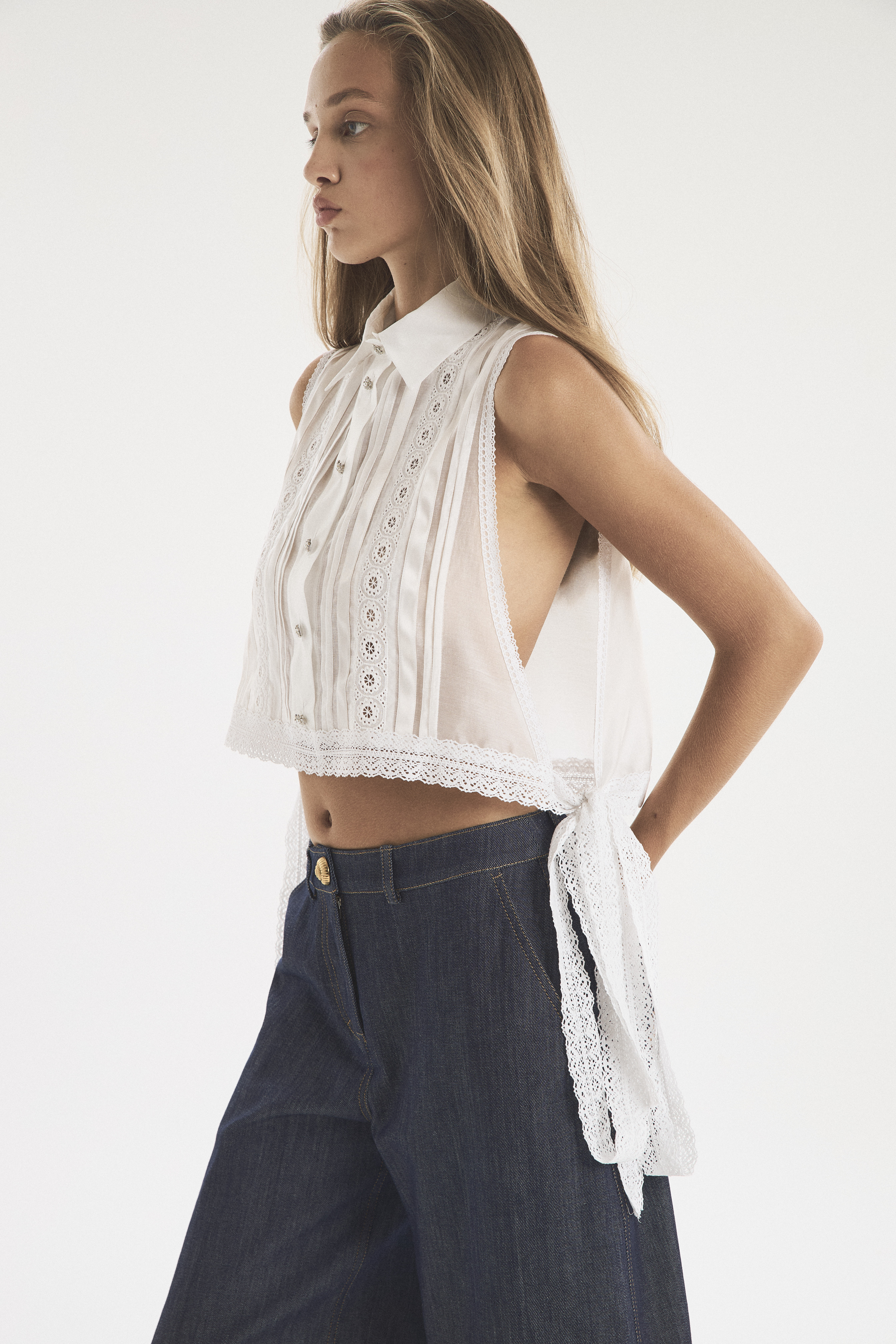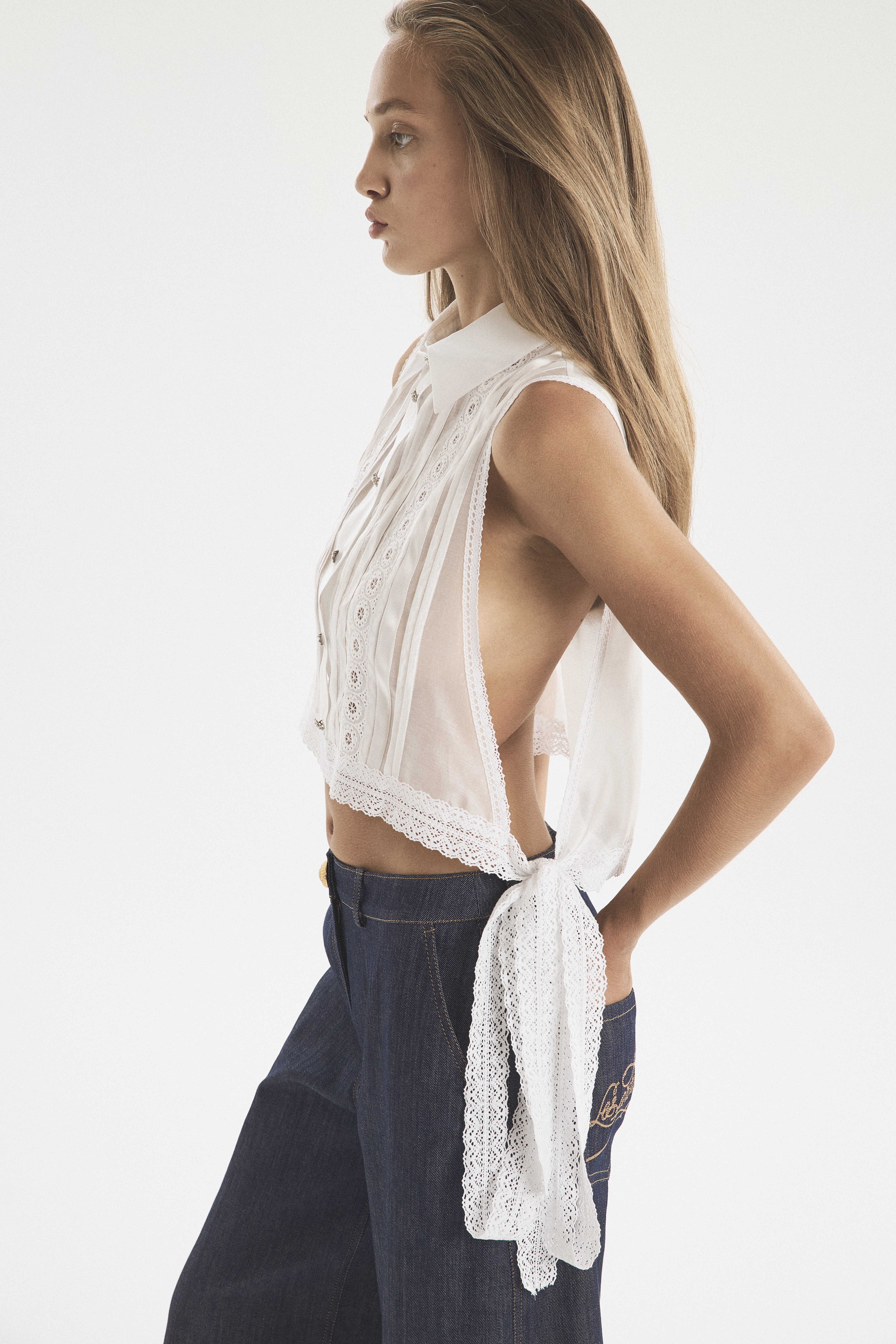 Жилет-обманка из тонкой полупрозрачной ткани. Держится на плечах и завязывается на талии, оставаясь открытым по бокам. Благодаря свободному крою манишка оставляет много воздуха между собой и телом, создавая аллюзию на легкость яхтенного паруса. Нижний край с завязками обрамлен широким кружевом. Тонкие застроченные складки на лифе — деликатный декор, который подчеркивает прозрачность основы и придает ей фактурность. Рубашечный воротник на стойке и имитация планки с застежкой под горло создают контраст с обнаженной кожей.