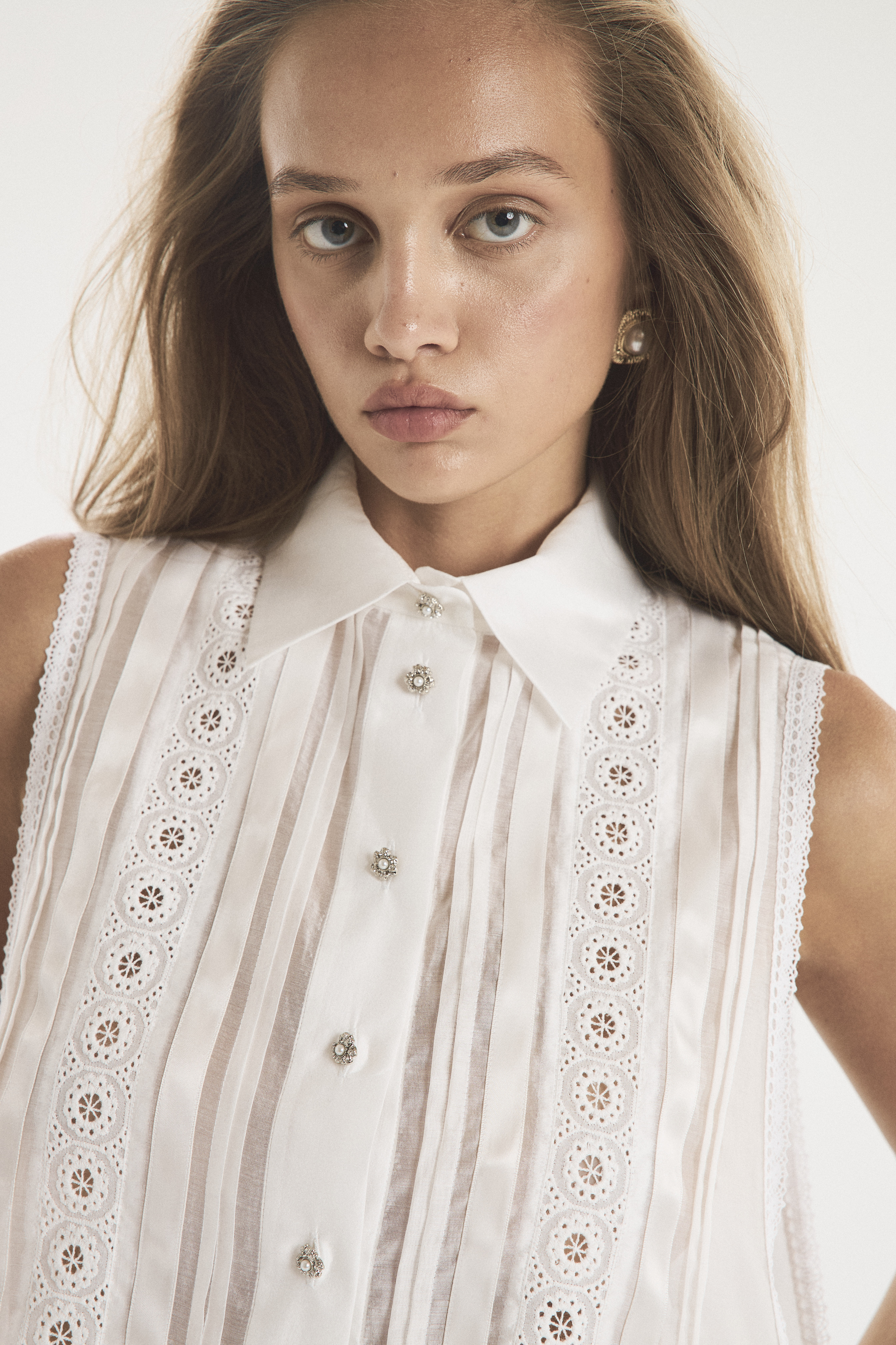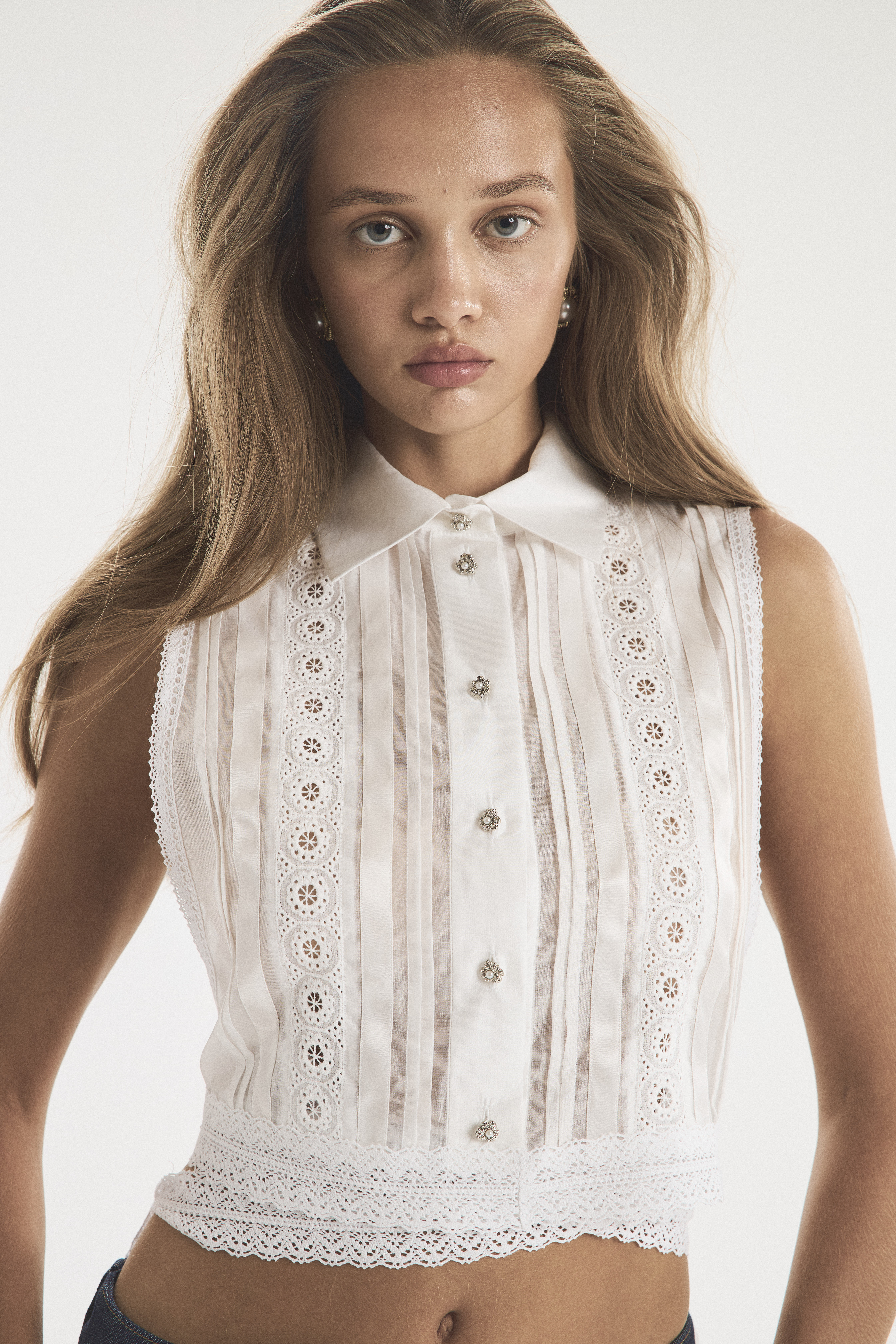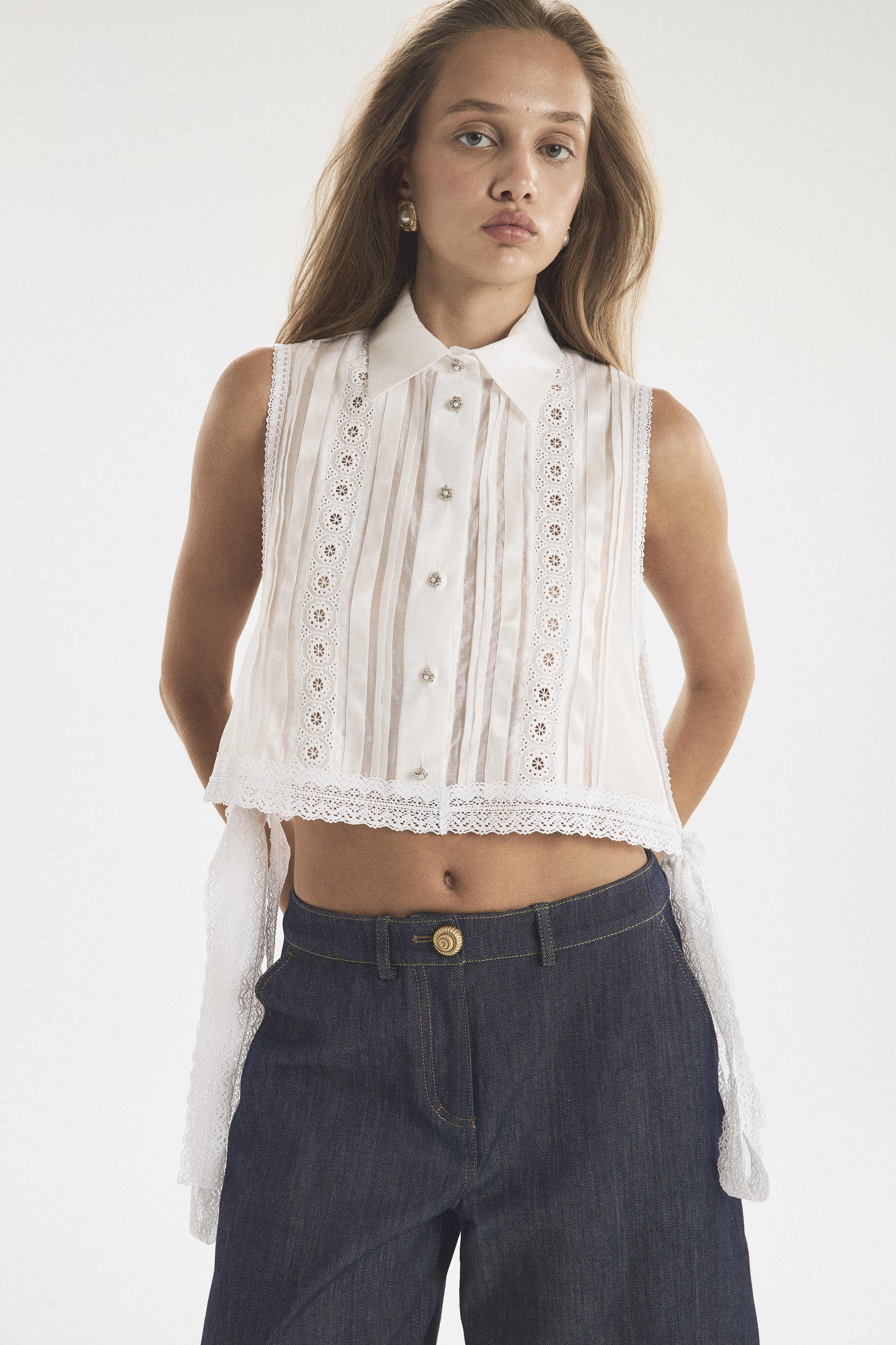 Жилет-обманка из тонкой полупрозрачной ткани. Держится на плечах и завязывается на талии, оставаясь открытым по бокам. Благодаря свободному крою манишка оставляет много воздуха между собой и телом, создавая аллюзию на легкость яхтенного паруса. Нижний край с завязками обрамлен широким кружевом. Тонкие застроченные складки на лифе — деликатный декор, который подчеркивает прозрачность основы и придает ей фактурность. Рубашечный воротник на стойке и имитация планки с застежкой под горло создают контраст с обнаженной кожей.
