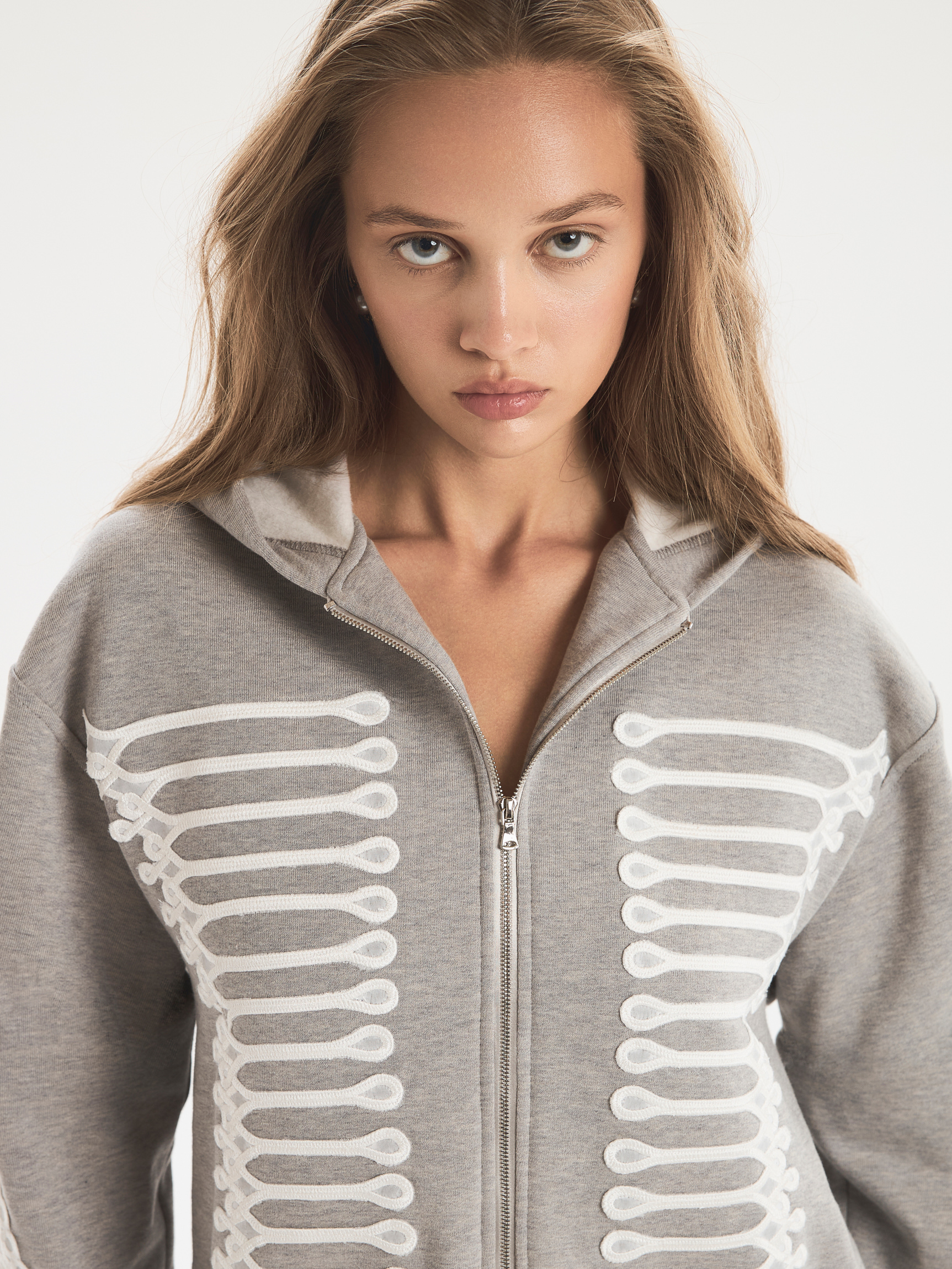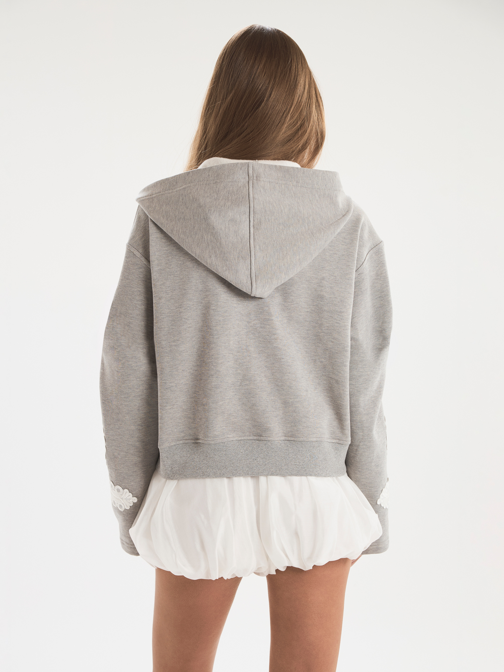 Худи из мягкого трикотажного футера на молнии. Модель отличает свободный крой, объемные рукавам и капюшон. Молния позволяет варьировать степень открытости, создавая разные образы — от спортивного до расслабленного. Нейтральная цветовая гамма делает худи универсальным, но небанальным элементом гардероба. Модель украшает кружевная вышивка, имитирующая элементы мундира в духе Napoleon jacket, и аппликации на рукавах.