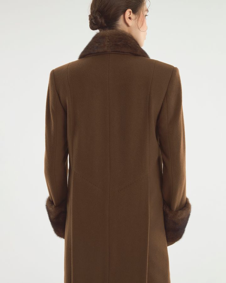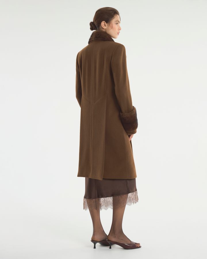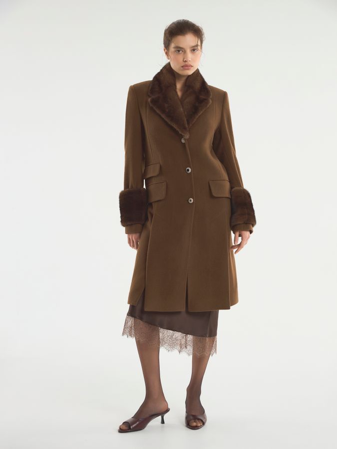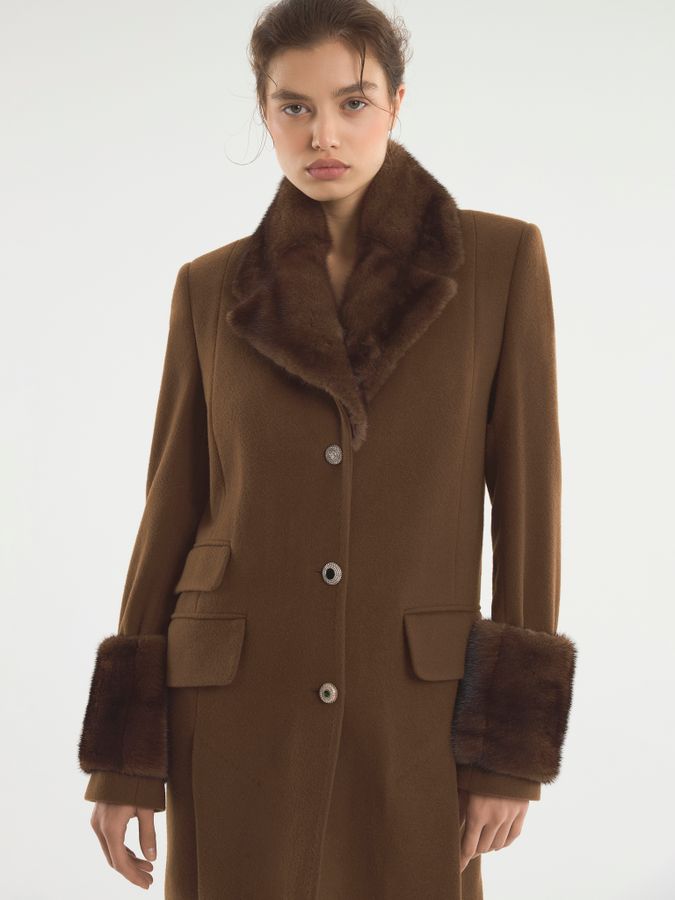 Шерстяное пальто с добавление кашемира, норковым воротником и меховой оторочкой на рукавах. Классический приталенный крой позволяет пальто красиво расходится в движении, не теряя при этом прямого силуэта. Пуговицы с налетом винтажа делают пальто предметом искусства. Носите с элегантными платьями и каблуками, а также с джинсами и тонкой водолазкой, превращая обыденный образ в королевский выход.