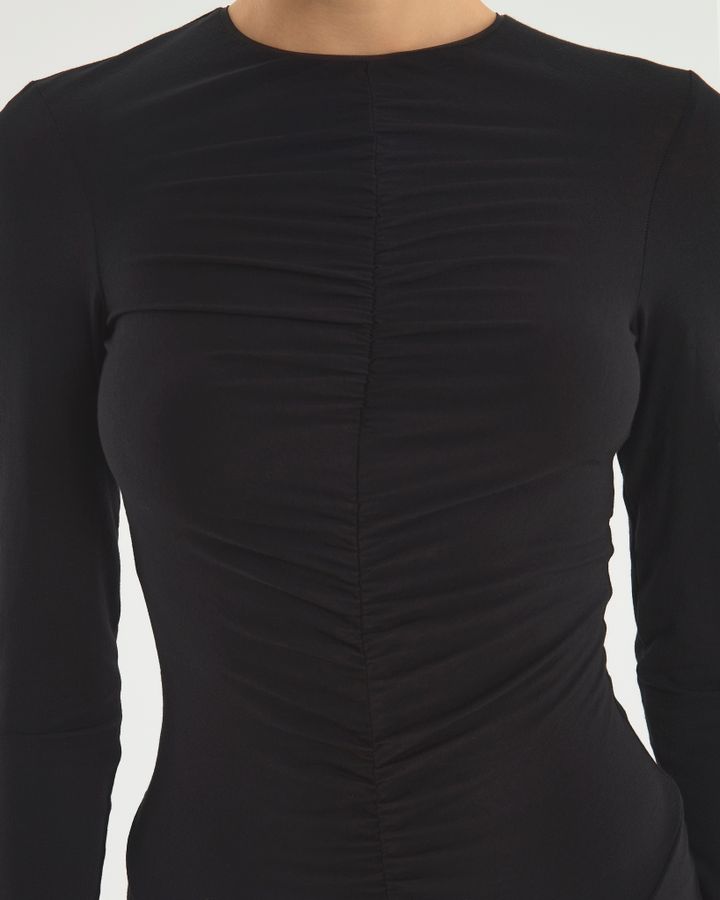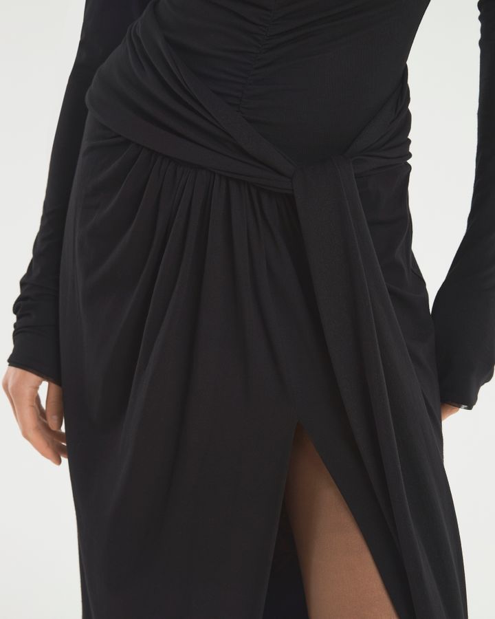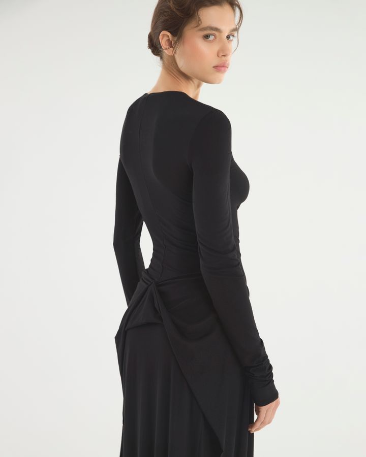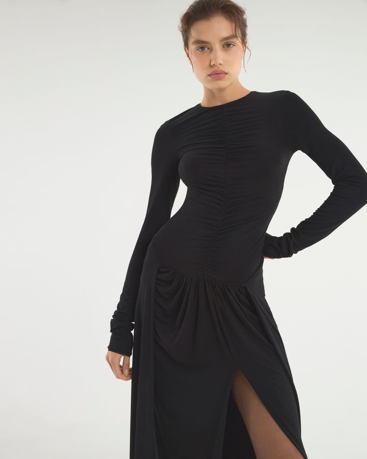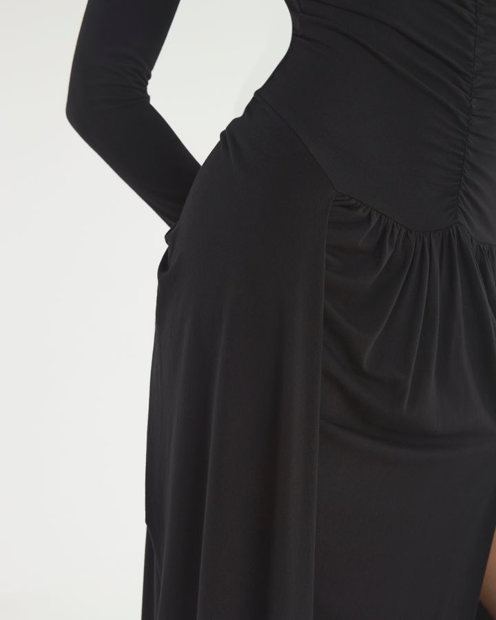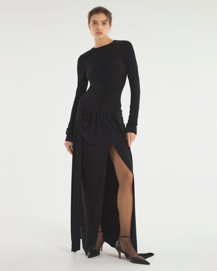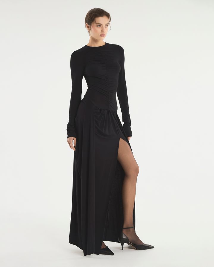 Платье облегающего силуэта в пол с собранным лифом и бондажными лентами. Чуть расширенный вырез под горло подчеркивает изящную шею, не отвлекая внимания от фигуры. Удлиненные рукава облегают тонкие запястья, носите платье без украшений или с крупными браслетами поверх рукавов. Высокий разрез спереди красиво расходится при ходьбе и обнажает ноги, когда вы сидите. Добавление эластана делает вискозу комфортной в посадке, платье вторит каждому вашему изгибу и движению. Опасное в своей обманчивой простоте, это платье покажет больше, чем сокроет, оставляя ощущение недосказанности.