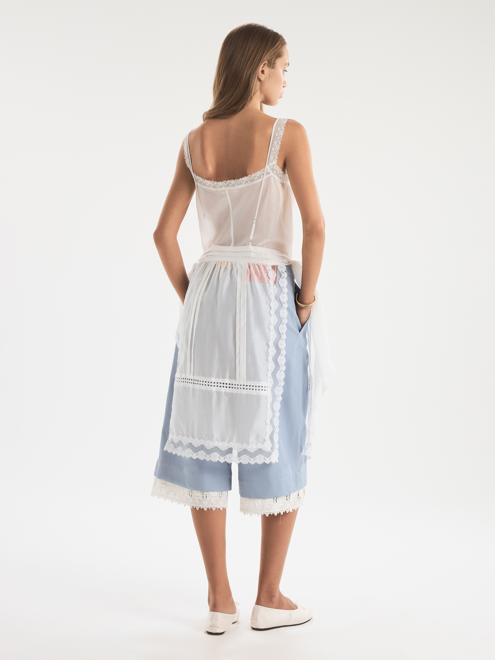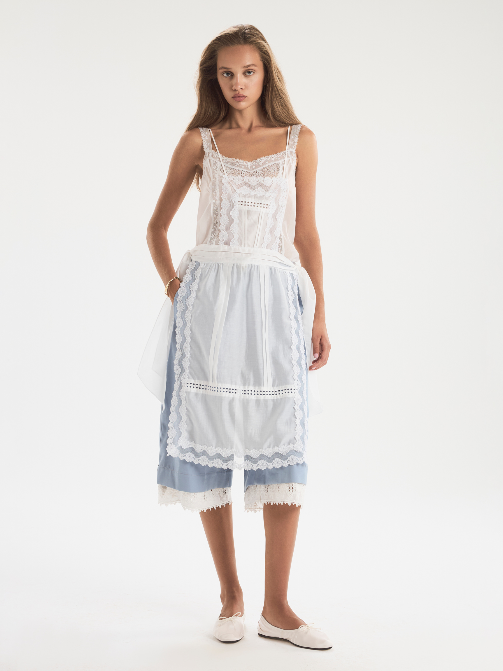 Нежный фартук из воздушного батиста с кружевом и шитьем. Модель держится на лямках и завязывает кружевным поясом на талии. Широкие лямки дополняют тонкие ленты, характерные для бельевого декора. Кружево и крой — винтажный шарм, вызывающий массу ассоциаций. Фартук можно носить поверх платьев, топов или комбинезонов, создавая сложные многослойные образы. Стильный и необычный элемент, разбавляющий базовый гардероб.