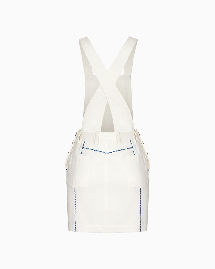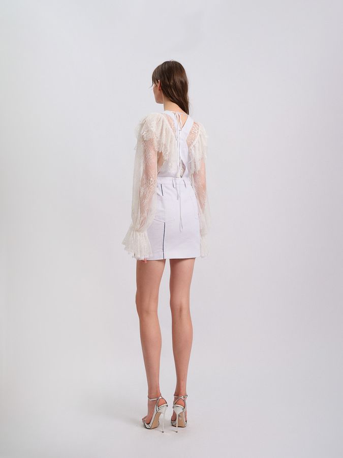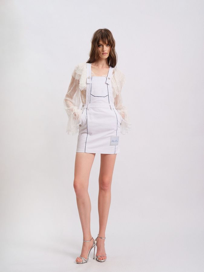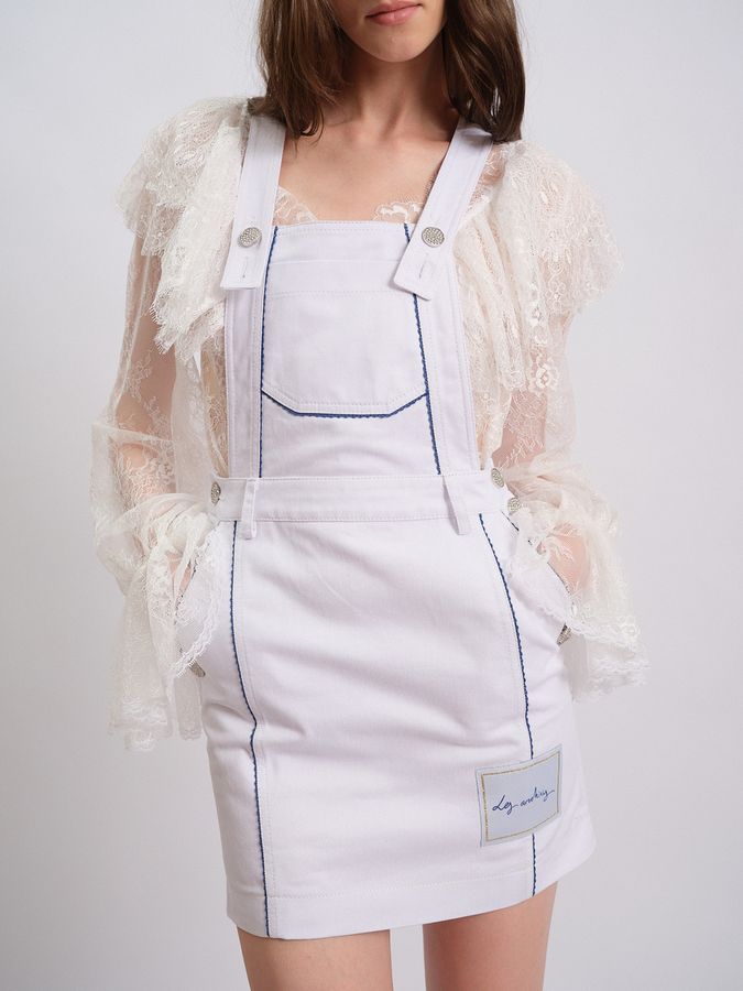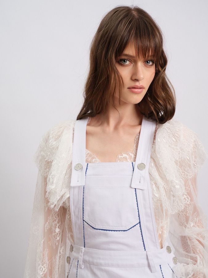 A denim mini dress with expressive stitching trimmed with contrasting festoon lace, a new interpretation of the Jane Birkin-inspired denim jumpsuit. Accented with shiny buttons at the sides, the brand's hallmark, give the look a playful vintage touch. Wear with lace blouses from the collection to highlight the expressive contrast of textures and add a romantic accent to everyday style.