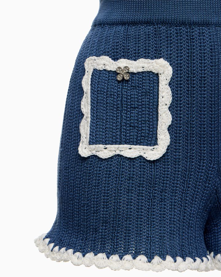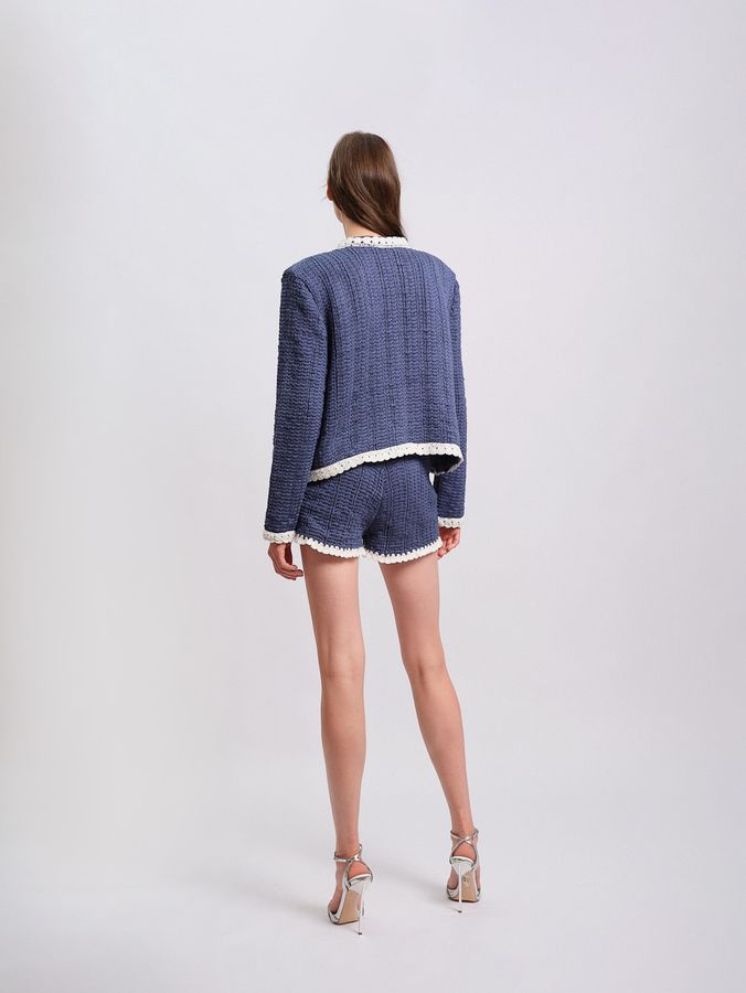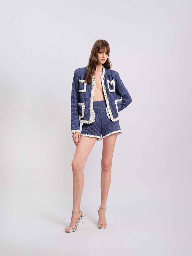 Вязаные мини-шорты — кутюрная интерпретация ваших летних фантазий. Каждый элемент в них продуман до мелочей. Длина изделия подчеркивает идеальные линии ног, позволяя акцентировать внимание на их совершенстве. Несколько видов вязки создают уникальную текстуру, которая привлекает внимание, а сверкающие ювелирные пуговицы становятся ярким акцентом, характерным для бренда. Контрастные окантовки на карманах - заигрывают с классикой и делают их еще более выразительными и актуальными. Стилизуйте шорты с монохромным жакетом, усиливая впечатление от образа или придумывайте свои смелые сочетания.