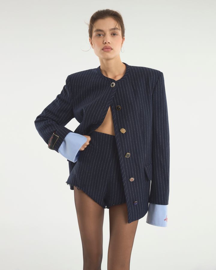 Короткие шорты в тонкую полоску. Высокая посадка с рельефами формирует силуэт подобно корсету, а вырезы по бокам — бесконечные ноги. Вещь можно носить с плотными колготками, ботфортами или кашемировыми чулками. Дополняйте тонкими джемперами и длинными пальто или сочетайте с оверсайз жакетом из той же ткани.