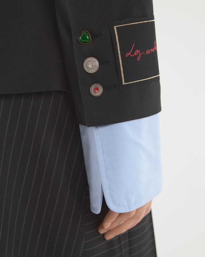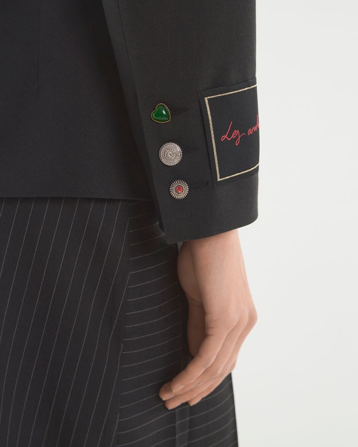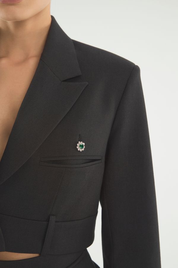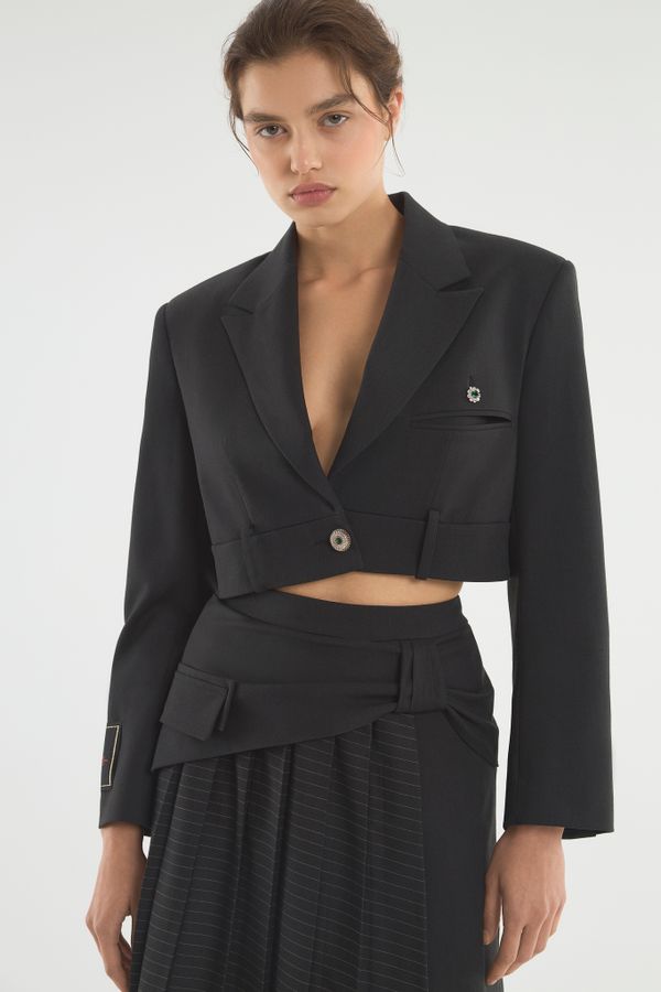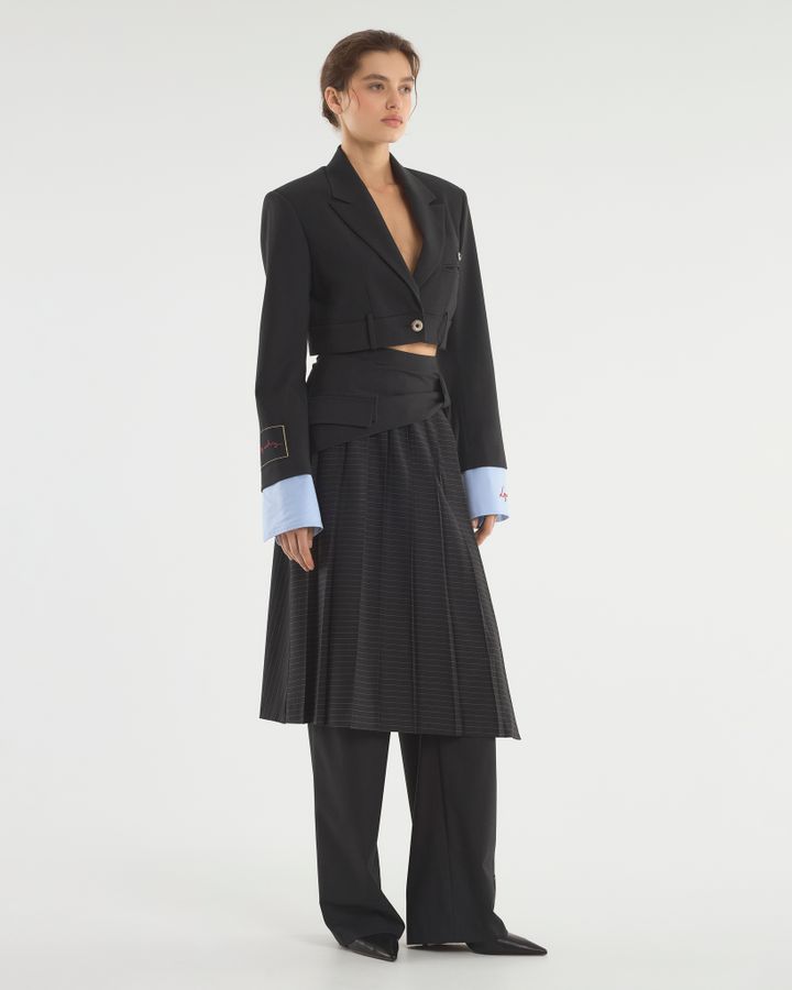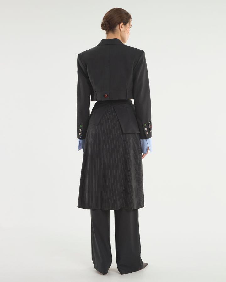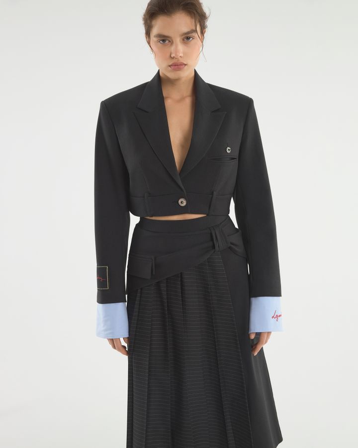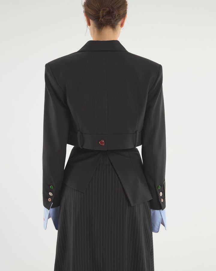 Укороченный спенсер с акцентными манжетами и поясом от брюк. Заканчиваясь до талии, жакет подчеркивает фигуру и визуально удлиняет ноги. Для усиления эффекта дополняйте его брюками или юбками с высокой посадкой, подчеркивающей талию. Усиленная линия плеча акцентирует внимание на прямоугольной форме силуэта, высокие голубые манжеты имитируют рубашку, надетую под. Деструктивность кроя с брючным поясом на жакете — нестандартное решение классического жакета прошлых лет. Носите модель поверх или на голое тело: обнаженная талия будет выглядеть интригующе.