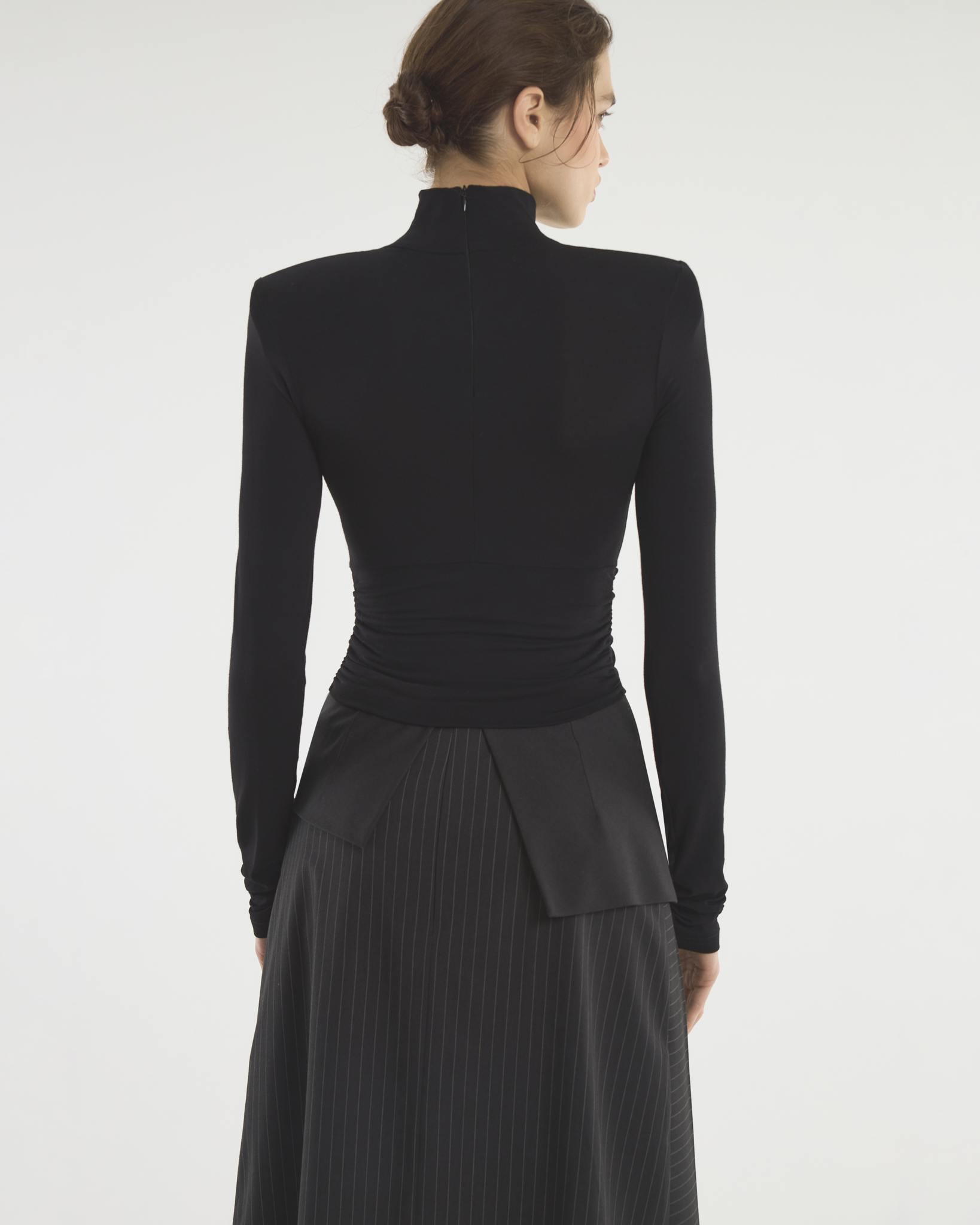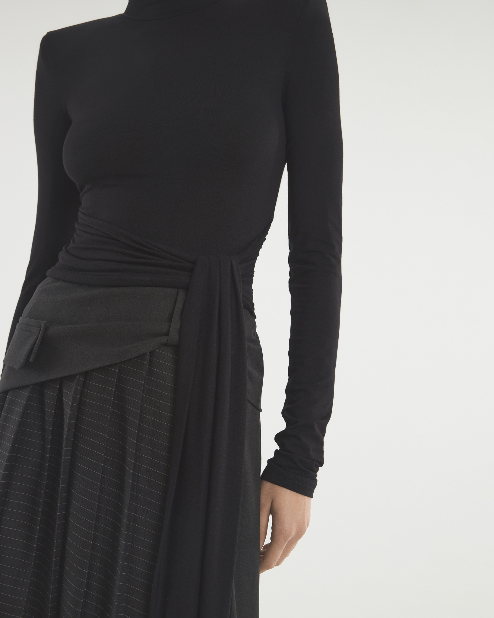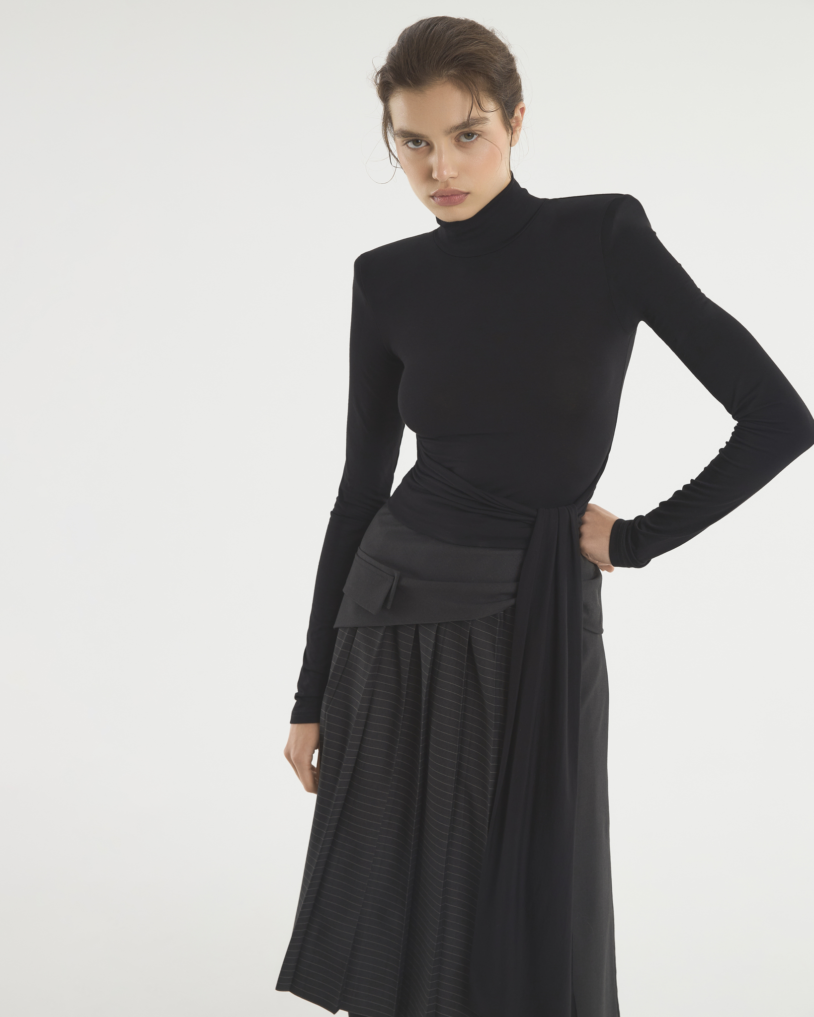 Водолазка с узлом на талии, который продолжается широкими лентами ткани. Акцентная линия плеча создает сильный силуэт, подчеркивая на контрасте хрупкость рук и тонкую талию. Облегающий силуэт с эффектными деталями особо выигрышно смотрится с широким брюками, объем которых уравновесит ширину плеч, создав женственный силуэт песочных часов — от облегающей горловины через широкие плечи к узкой талии и брючинам в пол.