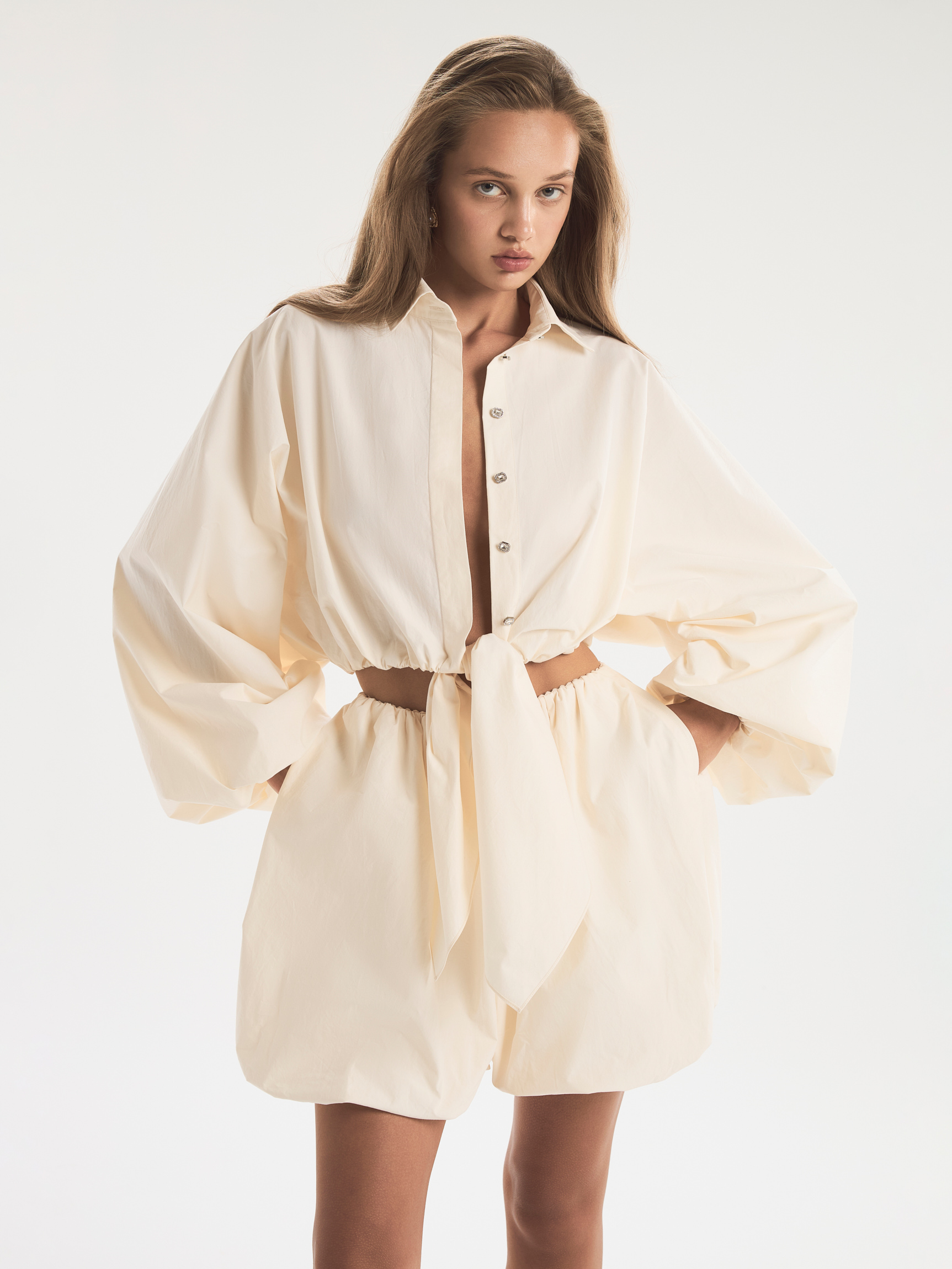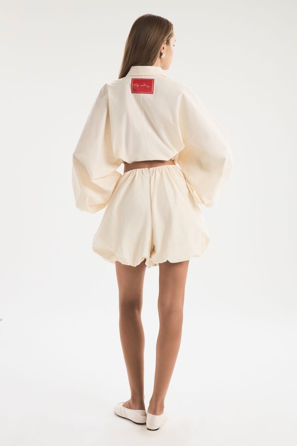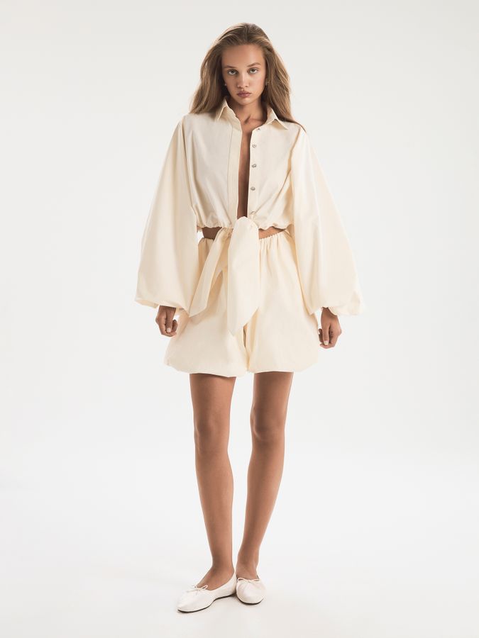 Короткие шорты-баллон создают невесомый объем без утяжеления. Сборки на бедрах вторят нижнему краю, делая силуэт гармоничным. Модель станет элегантной заменой юбки, позволив открыть солнцу максимум кожи и при этом не следить за каждым движением. Тонкая ткань красиво драпируется, спадая с бедер воздушным облаком. Шорты могут быть частью домашнего неглиже или выходным вариантом. Они хороши как самостоятельный предмет, так и в многослойных сочетаниях. Модель доступна в белом и кремовом вариантах.