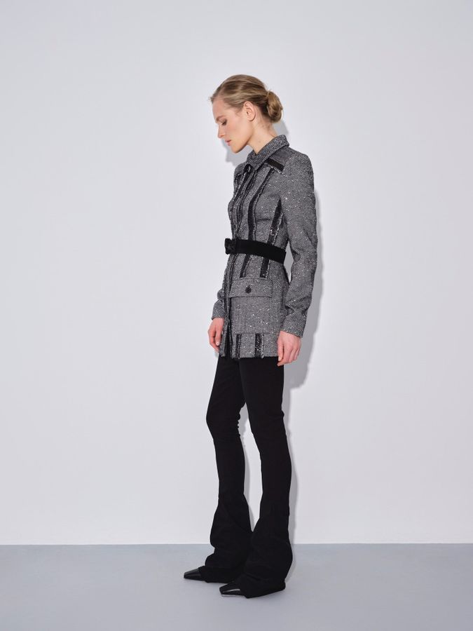 A fitted jacket made of dense suit fabric with sparkling sequins. There are always several jacket silhouettes in the brand's collection, in front of you is one of the sexiest and most popular. Wear it with a belt or more relaxed.
