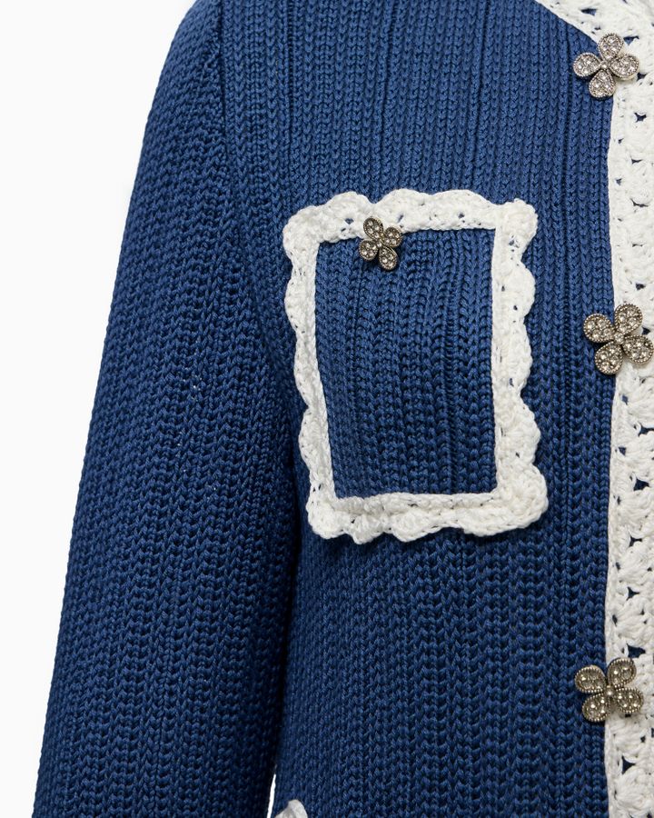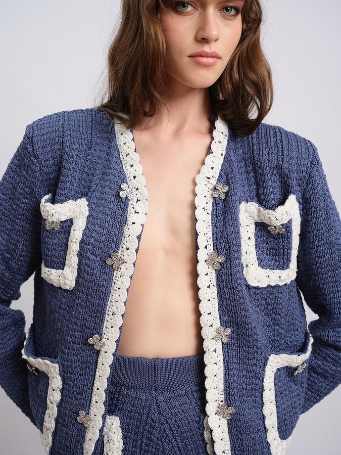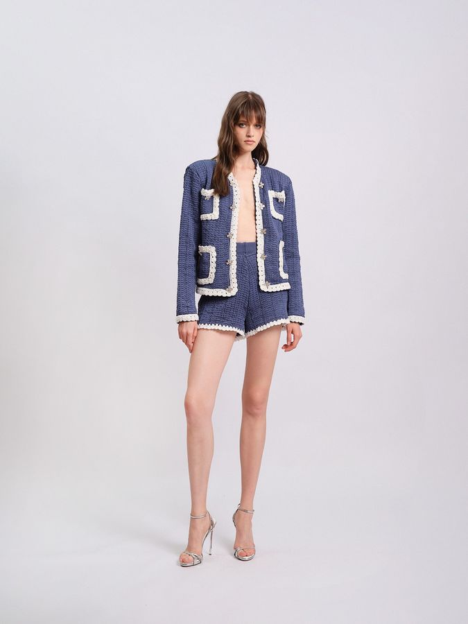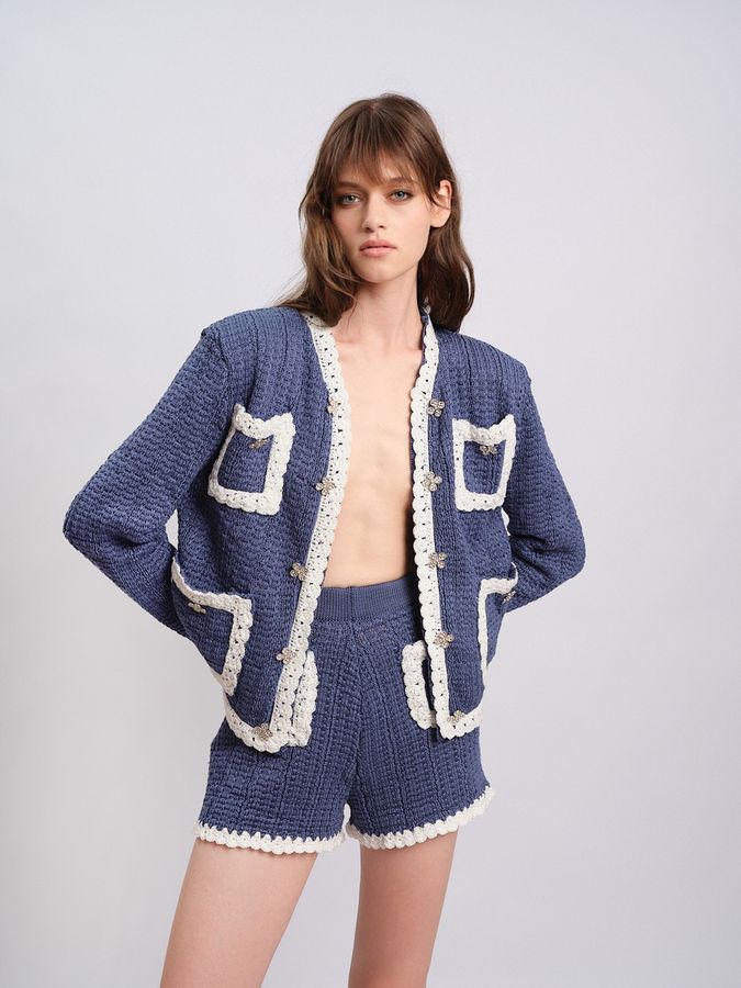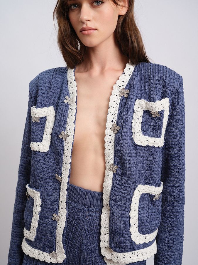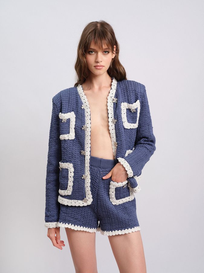 Этот вязаный жакет от Les Archives — современная кутюрная интерпретация классического укороченного жакета. Несколько видов вязки создают уникальную текстуру, которая привлекает внимание, а сверкающие ювелирные пуговицы становятся ярким акцентом, характерным для бренда. Контрастные белые детали, окаймляющие карманы и края жакета, придают ему дополнительную выразительность. Сочетайте его с монохромными вязаными шортами и босоножками на шпильке, завершая образ, но не выход в нем.