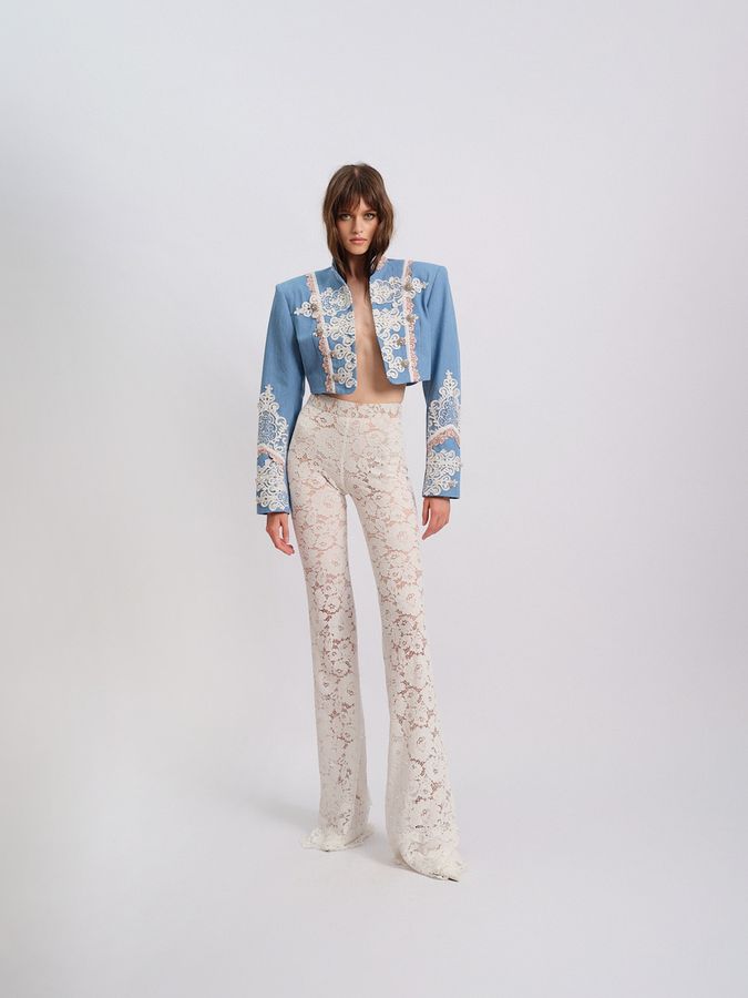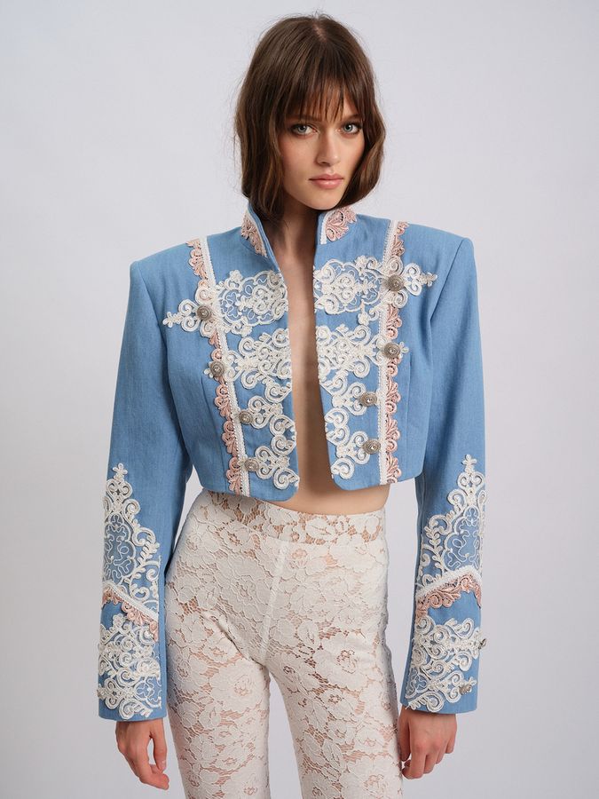 Укороченный колет, щедро декорированный винтажным кружевом, завораживает своей утонченной раскошью. Фигурные клеванты из французского кружева становятся выразительным акцентом, а объемные плечи придают силуэту эффектную архитектурность. Множественные слои отделки на рукавах сливаются в единый ансамбль, обыгрываемый воротником-стойкой, который завершает образ богемной роскошью.