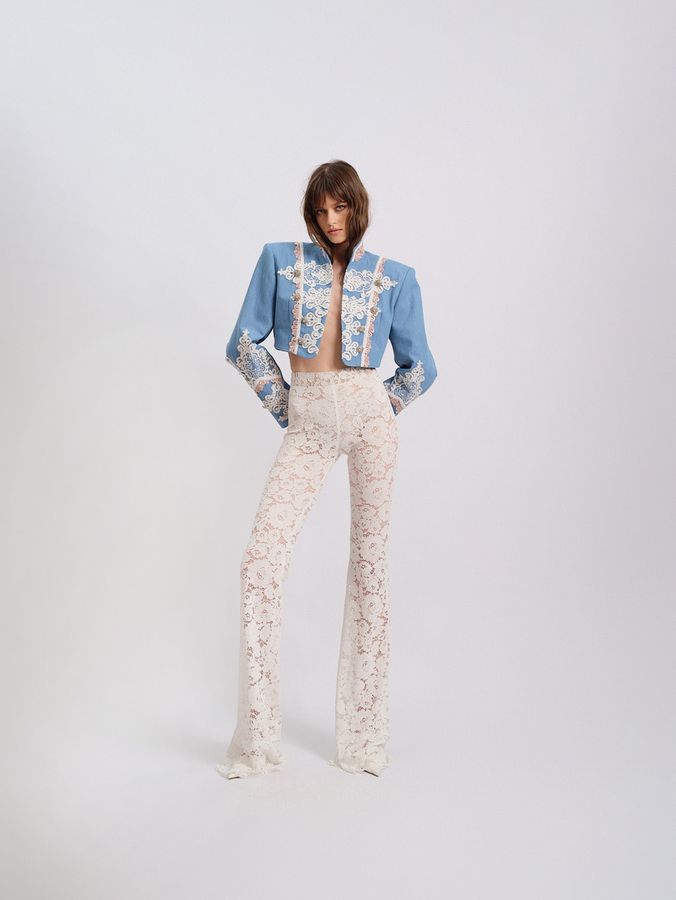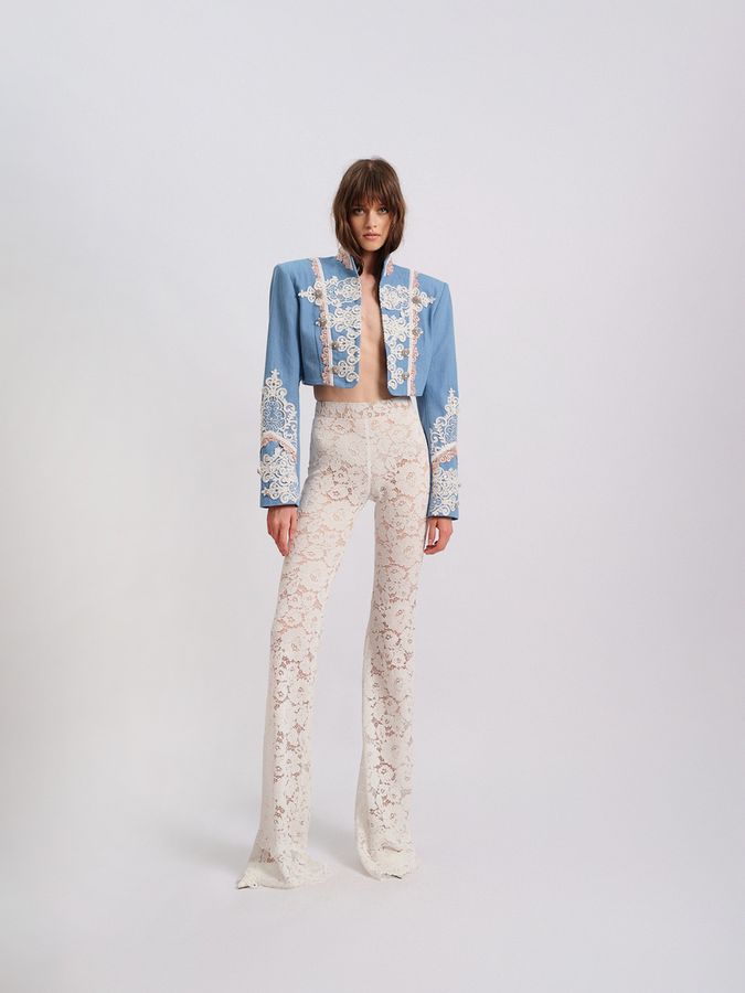 Стилизуйте жакет с облегающими гипюровыми брюками на высокой талии из коллекции бренда, чтобы подчеркнуть идеальный силуэт и тонкую игру фактур.